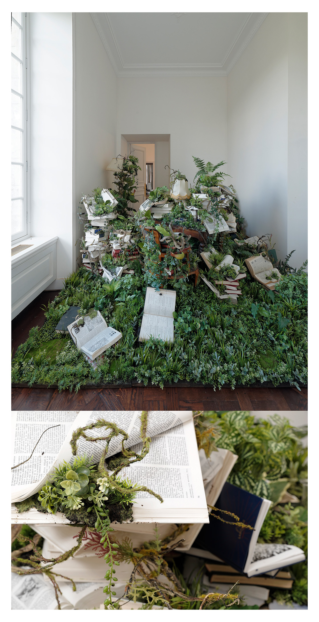 Your installations aren’t only impressive regarding the actual content, but in terms of scale as well... such as 'Still Library', which shows how nature forces its way back into civilization. Do you have an exact idea from the very beginning of which kind of technique you’ll employ for an idea? ||| Haha, “Still Library” is not that big! I have done much worse. Size is always linked to what you want to express and to how you want to touch your audience. Do you want to touch a certain body part or the memory? It’s a question of amplification. Like in music. You play a ballad for your girl, a cool thing for a group of friends, a powerful song for a stadium, or an easy thing for everyone to shake their butt to. There are many options, depending on the context.
