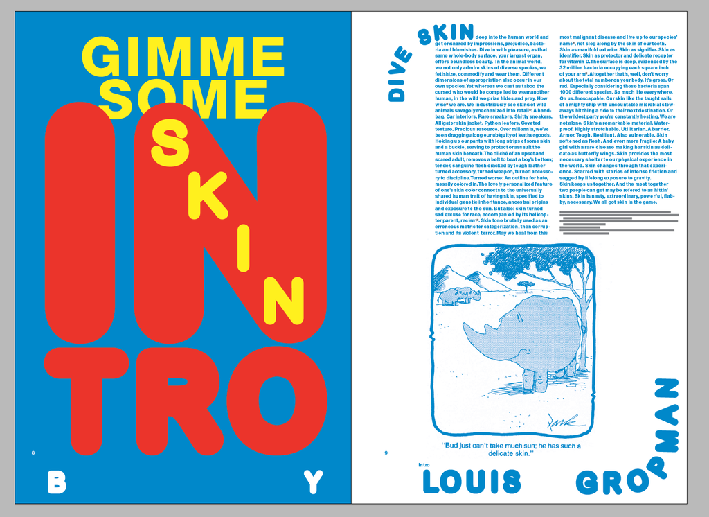 Dive Skin Deep into the human world and get ensnared by impressions, prejudice, bacteria and blemishes. Dive in with pleasure, as that same whole-body surface, your largest organ, offers boundless beauty. In the animal world, we not only admire skins of diverse species, we fetishize, commodify and wear them. Different dimensions of appropriation also occur in our own species. Yet whereas we cast as taboo the cursed who would be compelled to wear another human, in the wild we prize hides and prey. How wise1 we are. We industriously see skins of wild animals savagely mechanized into retail2: A handbag. Car interiors. Rare sneakers. Shitty sneakers. Alligator skin jacket. Python loafers. Coveted texture. Precious resource. Over millennia, we’ve been dragging along our ubiquity of leather goods. Holding up our pants with long strips of some skin and a buckle, serving to protect or assault the human skin beneath. The cliché of an upset and scared adult, removes a belt to beat a boy’s bottom; tender, sanguine flesh cracked by tough leather turned accessory, turned weapon, turned accessory to discipline. Turned worse: An outline for hate, messily colored in. The lovely personalized feature of one’s skin color connects to the universally shared human trait of having skin, specified to individual genetic inheritance, ancestral origins and exposure to the sun. But also: skin turned sad excuse for race, accompanied by its helicopter parent, racism3. Skin tone brutally used as an erroneous metric for categorization, then corruption and its violent terror. May we heal from this most malignant disease and live up to our species’ name4, not slog along by the skin of our teeth.