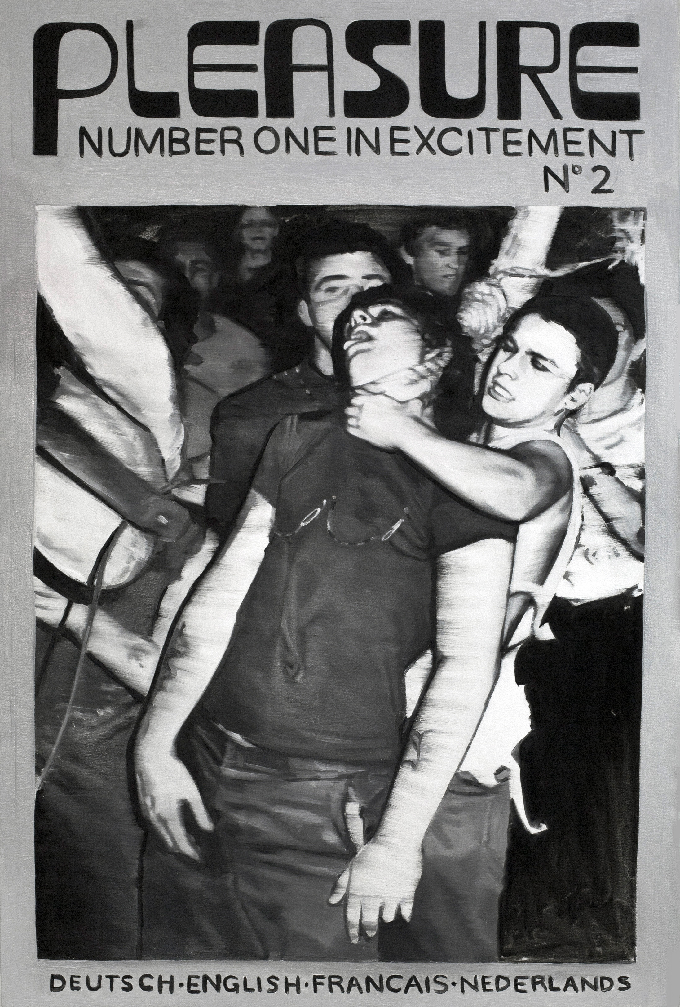 Gazing eyes and marked bodies. There’s something in the paintings of Brooklyn-based artist Kelsey Henderson that will subtly fill you with unease. It’s not necessarily the scenario she captured, but the things that must have happened before that very moment, where debauchery and an unhealthy level of overestimating one’s own capabilities lead to awkwardness and massive regret. Over the last few months though, her highly impressive work has undergone a slight change of direction, as she took a break from her photorealistic snapshots in order to juxtapose black and white images from the hardcore and punk subcultures with headlines from vintage porn magazines - stunning paintings that will hopefully lead to an extensive series in the very near future. Time for Lodown to investigate a bit further.