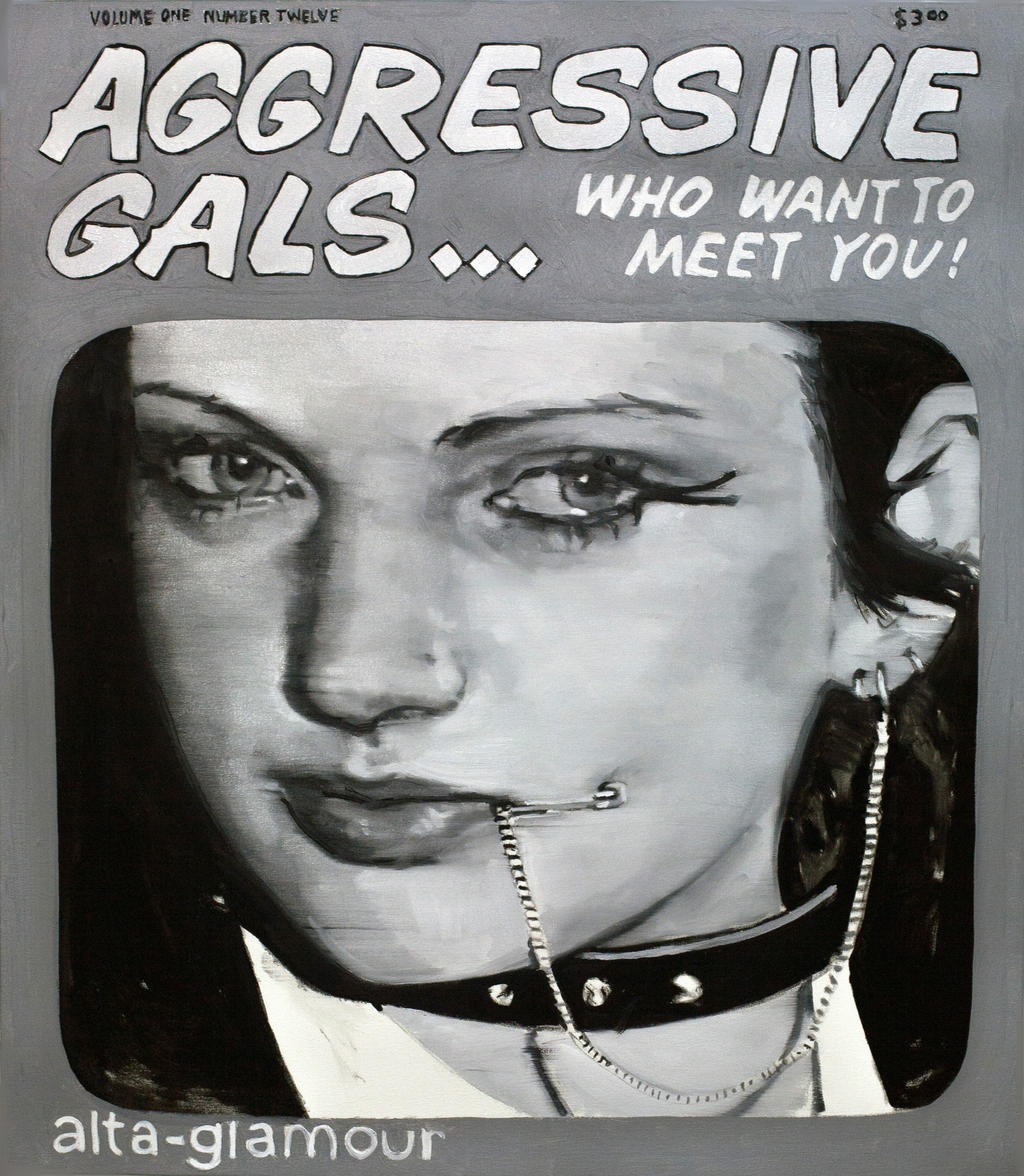 One of the found images I painted was a cover from an 80s Boston hardcore documentary... it looked like a magazine cover but upon researching I realized it was collaged. I pretty much took the idea and ran with it. All the text in this series comes from old porn magazines. I'm picking ones that don't blatantly say anything sexual and combining vintage subculture imagery to go along with it to create completely different readings... poking fun at consumerism and cultural ideals, messing around with fashions disconnected fascination and fetishization of punk culture, while also genuinely trying to show these subcultures in a context to have them seen as something noteworthy and important.