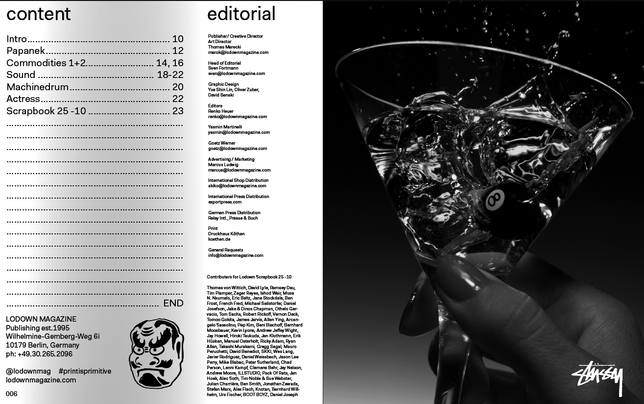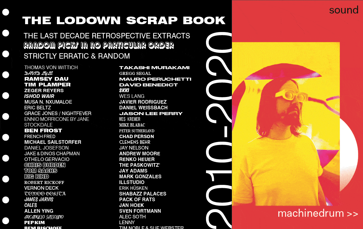 The LODOWN 25 − 10 SCRAPBOOK includes artwork, features, scribbles and thoughts by James Jarvis, Kevin Lyons, Actress, Jason Lee Perry, Thomas von Wittich, Zeger Reyes, Pep Kim, Daniel Josefson, Andrew Jeffrey Wight, Wes Lang, Illstudio, Daniel Weissbach, Machinedrum, Arcangelo Sassolino and many others.