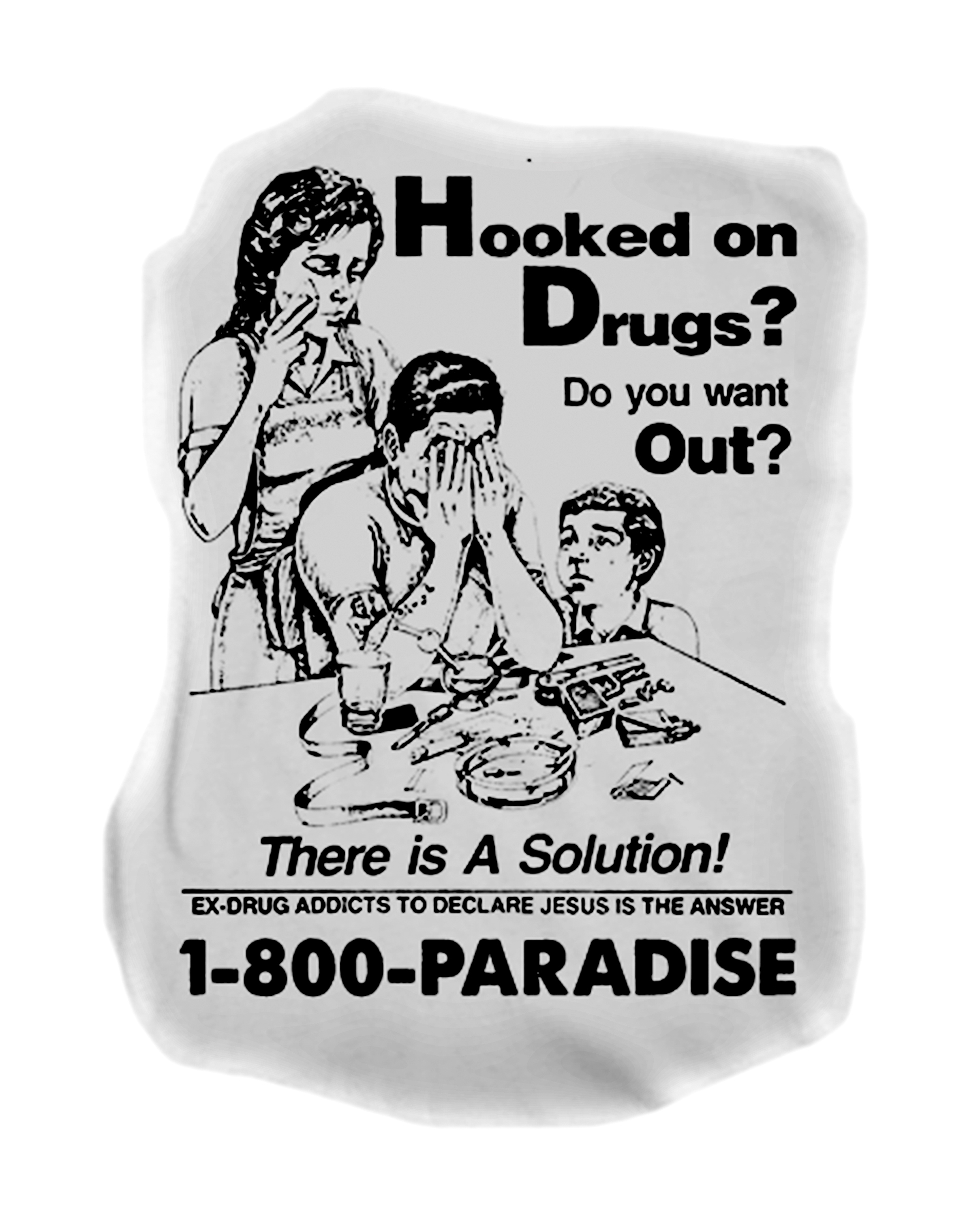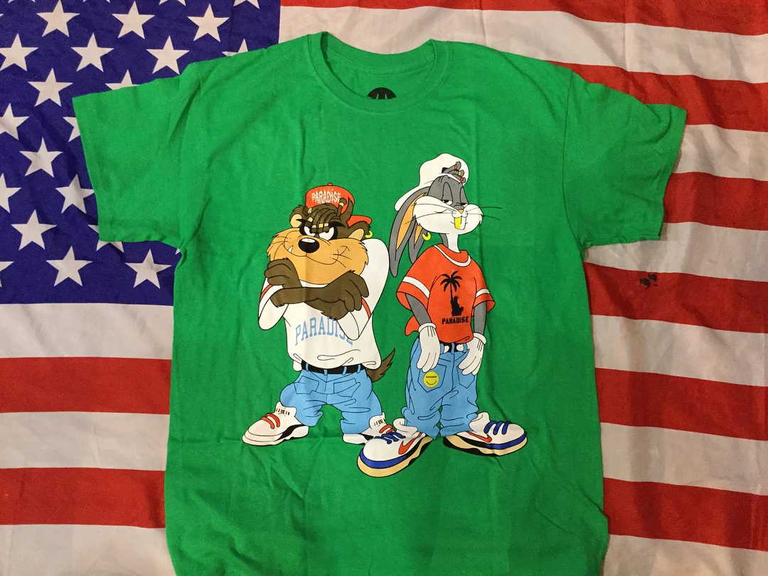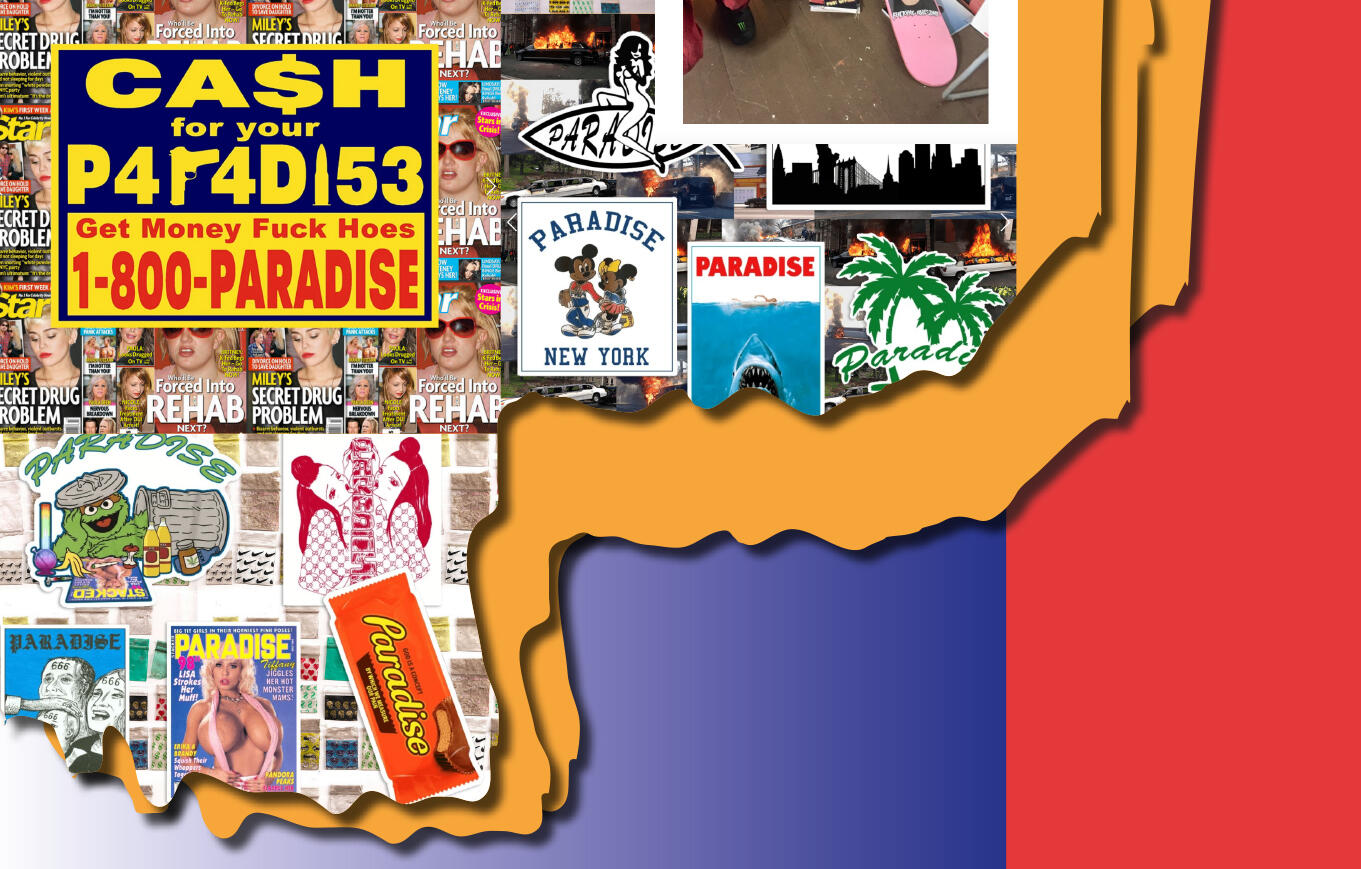 It actually started as ‘Palisades Paradise’ after I was skating with friends near the beach around some town called Pacific Palisades kinda near Malibu. It’s a rich area and it all seemed so artificial and inauthentic compared to the more urban places we mostly skated. Yuppies and jocks, convertibles, blondes, surfboards and frat boys were everywhere. It felt like we were in a bad 80’s movie or some kind of artificial paradise or something… We were all joking about it and when I got home I decided to make a shirt based on the concept. I eventually realized that just the word “Paradise” worked better and so that’s what we eventually named the brand. I had just moved to New York and the name Paradise was so common we couldn’t trademark it, so we made it PARADIS3 and/or PARADISE NYC. It’s a great word ‘cause it can be used and read ironically or sincerely (or both at the same time) in all kinds of situations creating a kind of ambiguity that’s really interesting to me. By using it with different images it can kind of capture and comment on the weird, conflicting, bitter-sweet feeling of existence.