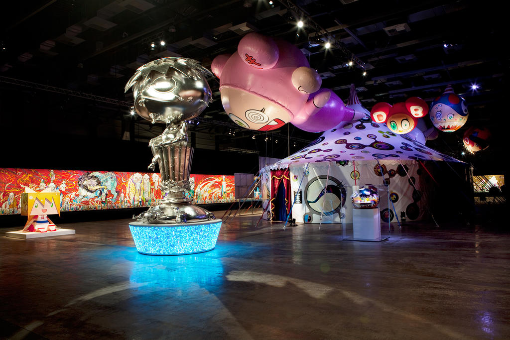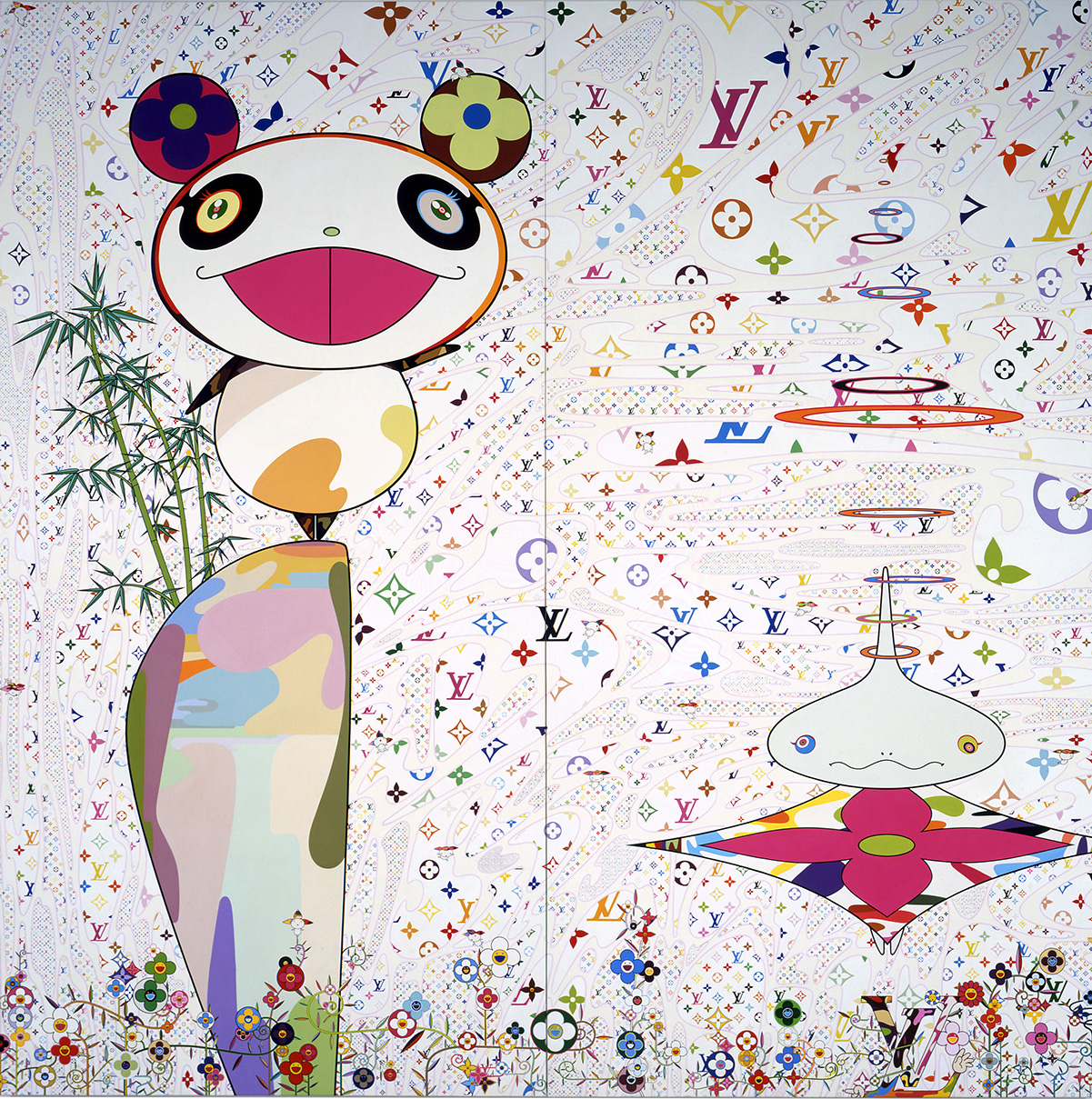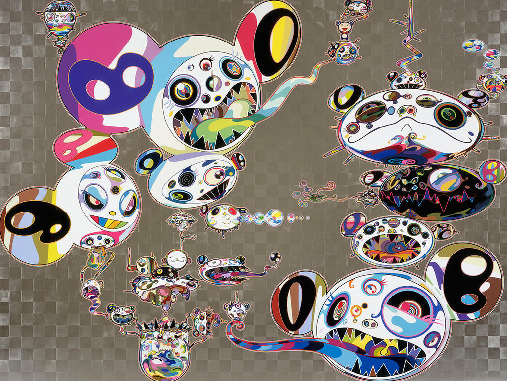 In 2000, Murakami published his “Superflat” theory in the catalogue for a group exhibition of the same name that he curated for the Museum of Contemporary Art, Los Angeles. The theory posits that there is a legacy of flat, 2-dimensional imagery which has existed throughout Japanese art history and continues today in manga and anime. This style differentiates itself from the Western approach in its emphasis on surface and use of flat planes of color. Superflat also served as a commentary on post-war Japanese society in which, Murakami argues, differences in social class and popular taste have ‘flattened,’ producing a culture with little distinction between ‘high’ and ‘low’. The theory provided the contextual background for his work and he further elaborated on it with the subsequent exhibitions, “Coloriage” (2002, Fondation Cartier pour l’art contemporain, Paris) and “Little Boy: The Arts of Japan’s Exploding Subculture” (2005, Japan Society, New York). These exhibitions helped introduce Japan’s lesser-known creative culture overseas and such curatorial projects would become an integral part of Murakami’s multifaceted artistic practice. In accordance with the Superflat concept, Murakami’s practice involves repackaging elements that are usually considered “low” or subcultural and presenting them in the “high-art” market. He then further flattens the playing field by repackaging his “high-art” works as merchandise, such as plush toys and T-shirts, making them available at more affordable prices.