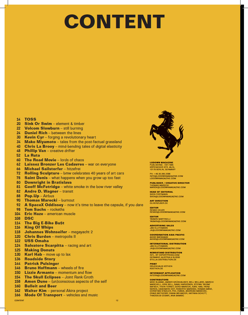 Vehicle. Vehicule. Vehikel. See, the term itself already suggests that this issue will be about different, and predominantly motorized, forms of transportation - and there will be bits about the fetish of the vehicle itself, don’t worry - but in actuality it’ll be much more about getting from A to B, an examination of artist’s positions about spiritual, intellectual and physical mobility. It’s about the transportation of information and ourselves within this ever moving networks we find ourselves tied in. Specific rituals and religion can be vehicles for entering stillness and getting certain ideas across, but the same thing can be said about a canvas. Traveling defines our reality, doesn’t matter if you do it the 5G way or by using the excursion train of thought. Every presence has a million turning points - sometimes they lead to dead ends, sometimes to major breakthroughs. We derive from the past, but force ourselves to tell our own future. Science is fantasy and art is friction. Information is for everybody, you simply cannot outsource democracy since technology has the potential beyond controlling our everyday lives. There’s a reason we all travel more than ever before, right? Phew, this was getting a bit too much back and forth through the doorway of my upper head, wasn’t it?! Anyway, here’s another new issue to make your legs twitch and put your grey cells up there into positive vibration, another documentation of international artistic activism against all odds which just loves to feed the mainstream with grassroots craftsmanship. Nobody moves, nobody gets hurt? Wow, what a boring world this would be.