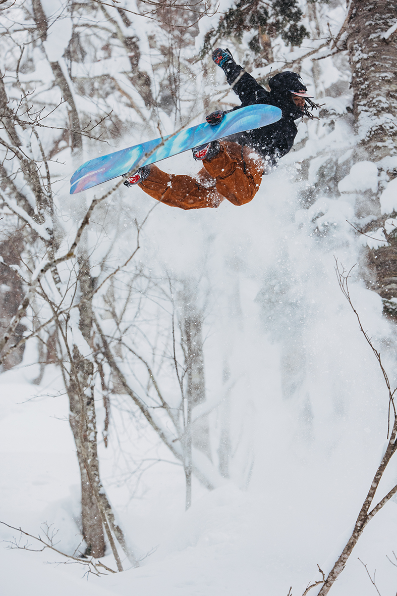 “Yeah, I don't know. I really I think it looks fine, but it's a lot to move around and get it popping when it comes to jumps and stuff. But just riding powder, oh it floats. It truly does feel like a boat, like floating. Honestly, I need to rip it more, like steep slopes on that thing are so sick. I found a little spot, like tight trees and stuff, and it almost skates. I remember that’s the most hype I got the whole trip. We were riding out of the zone and I was in this little area where it should not be. And it was just ripping. And I was like ‘Oh my God, this thing is soooo sick’. It just floats differently.”