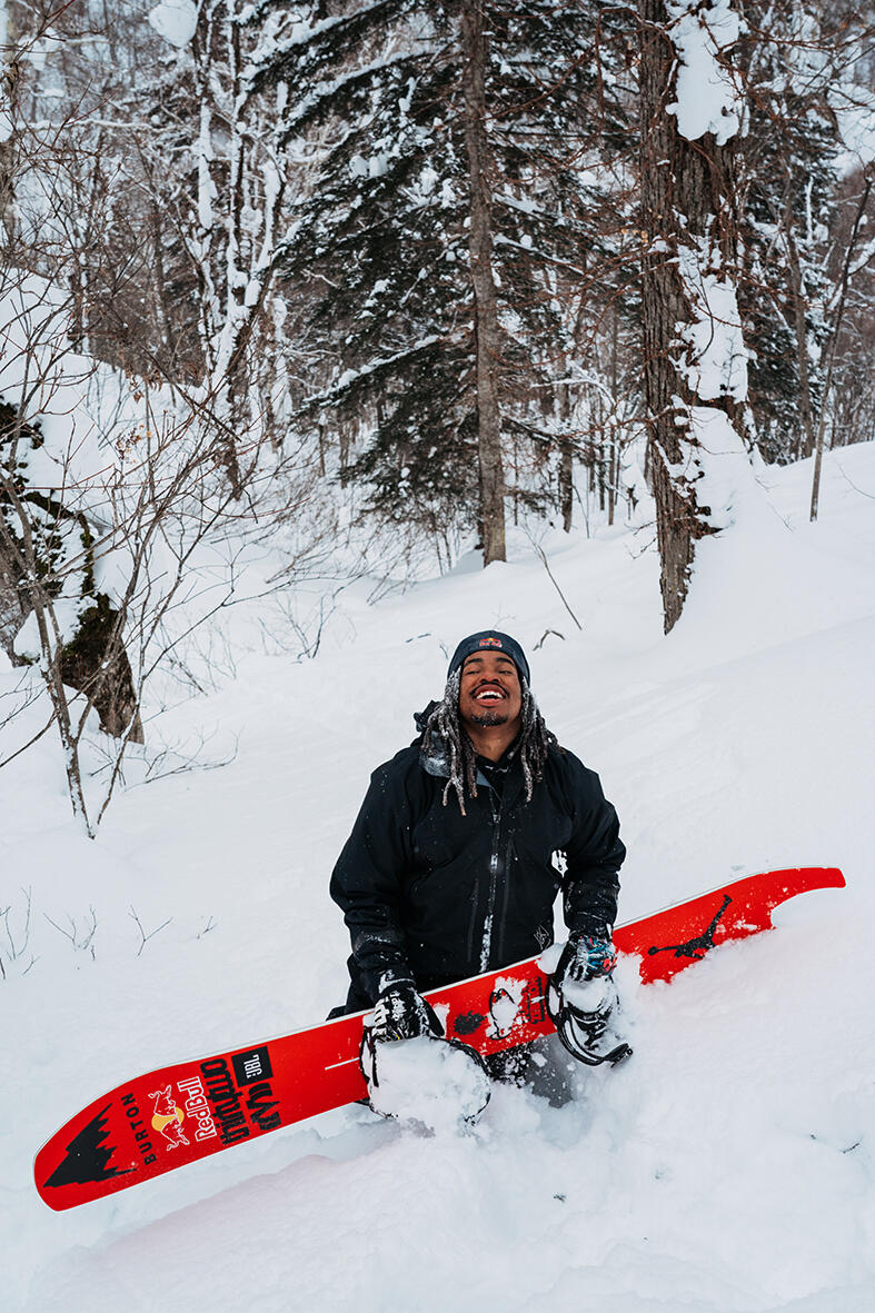 “I don't like to dive into it too much. It's a good question, though. I’d say my take on it and I never even really thought about this. I grew up in an adopted family, so we’re all different, loads of colours. My parents are white, one of my brothers is bi-racial, one of my sisters is black Asian Indian, one of my sisters is white. I'm just black. So, like, all different colours. And we grew up in North Carolina, in small-town South, so you would think we would have to deal with a lot of racism. My brother ended up dealing with some, but I didn't really deal with any. I never really had to deal with it on the mountain either. And I feel like it's really about perspective sometimes. You know, if you lean into the fact that you're black and people don't like you, maybe you're playing into it. I don't know, I'm just saying my perspective on it is that I never really thought that way in the first place. I was genuinely just always having fun with my snowboarding. Never looked at my skin.”