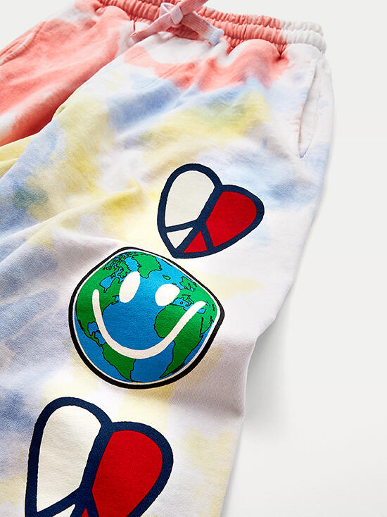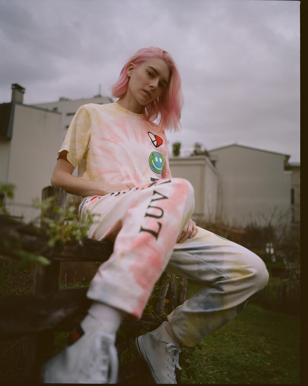 The capsule’s aesthetic was inspired by oversized and comfortable band tour merch. T-shirts, hoodies and sweatpants feature tie-dye coloring, funky fonts and vibrant street style graphics including a branded peace sign, heart and planet earth.