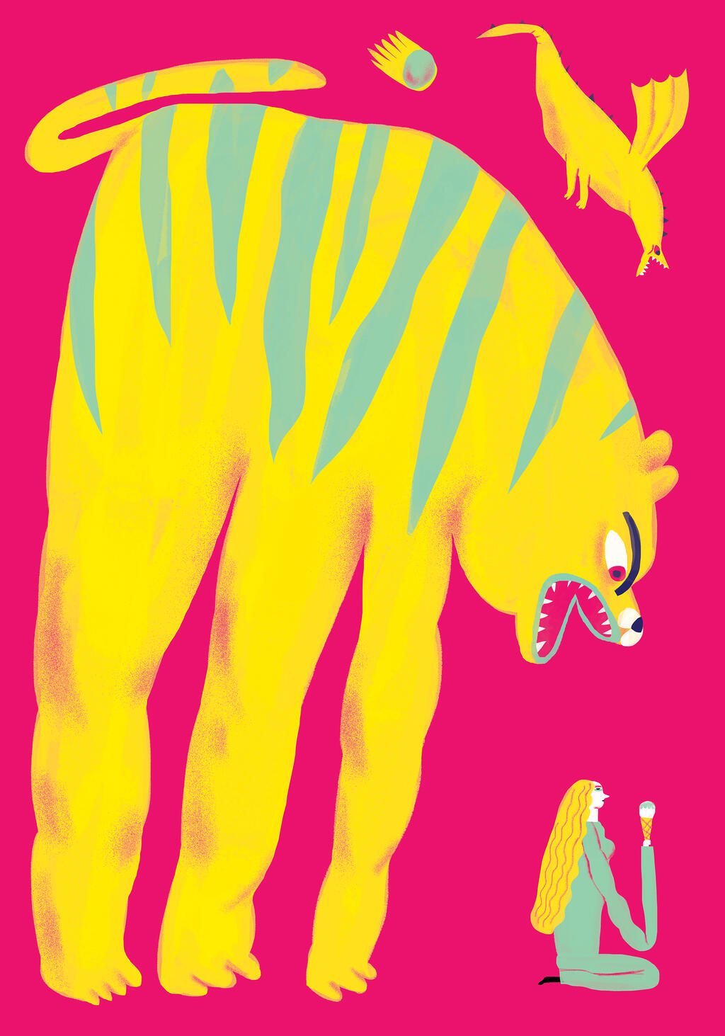 Even before the Sunday spectacular, the Berlin audience can gain impressions of the current avant-garde of figurative design at various galleries in the centre of the city. A group show in an abandoned building in the cemetery of Alter St.-Marien- und St.-Nikolai presents the ‘flesh suits’ of Daisy Collingridge, grotesque sculptural depictions of our human corporeality, while Viviane Schwarz’s interactive installation, Restless Spirit, features the ghosts of astronaut dog Laika and astronomers Kepler and Galileo in a reflection on the limits of reality and the medium light. Illustrators Simon Landrein, Jordan Coelho and Shir Pakman showcase their style-defining human portraits, and Júlia Farkas entertains with animated loops of humorous imagined beings.