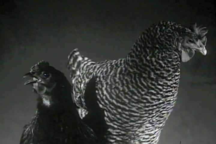 Californian chickens and a kind of evil looking duck step into the spotlight in Aaron Rose's Warhol-inspired mock screen tests.