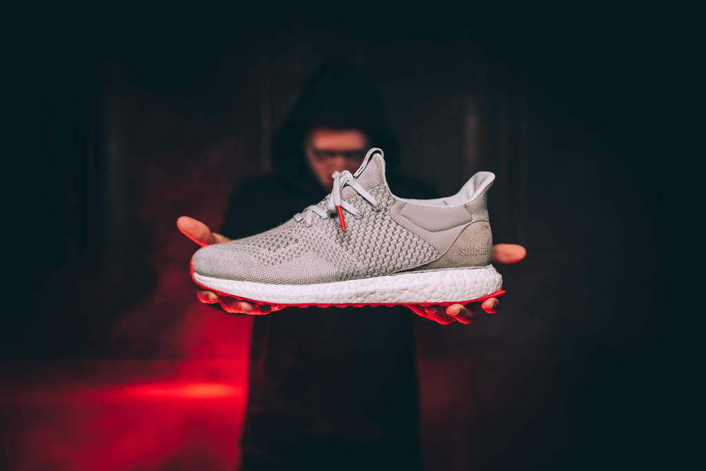 Be prepared with Solebox’ UltraBOOST edition, designed by Hikmet Sugoer. The district’s coat-of-arms is the inspiration for their execution and comes in different shades of grey, that are complimented by the comfy white midsole. A hint of green and the strong red outsole contrast the smooth wool and suede upper. This version is offering extra freedom without the TPU cage while enhancing the shoe’s clean aesthetic. The crisp Solebox debossing on the shoe’s heel cup brings the icing on the cake and completes the look.