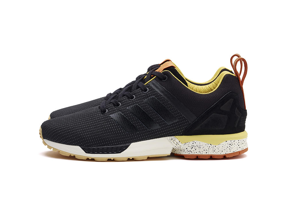 The ZX Flux BDGA's upper is made of black woven nylon combined with suede leather at some points. While the heel part of the sole is sprinkled and kinda looks like straciatella, the bottom comes in a soft yellow and some carrot-like orange which gets picked up on the inside and the tongue.