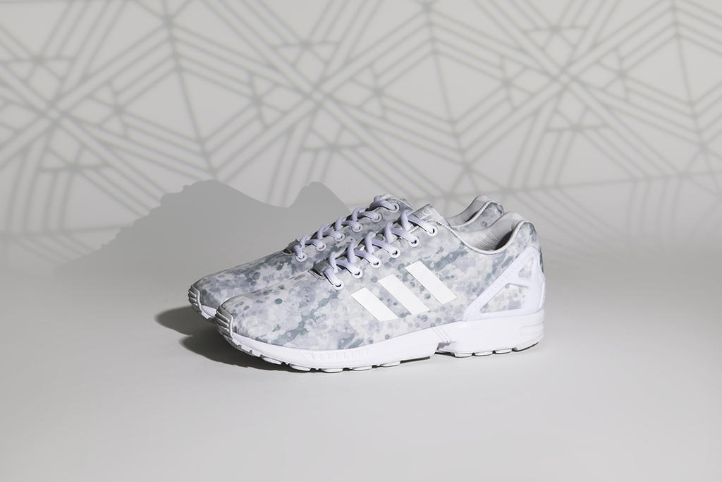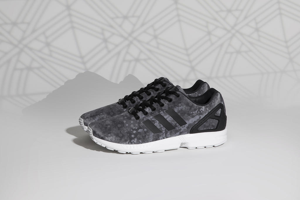 For the ZX Flux, the shoe has been rendered in black and white colourways of a classic German flecktarn camo and an exclusive lace clip featuring the label’s standout geometric motif.