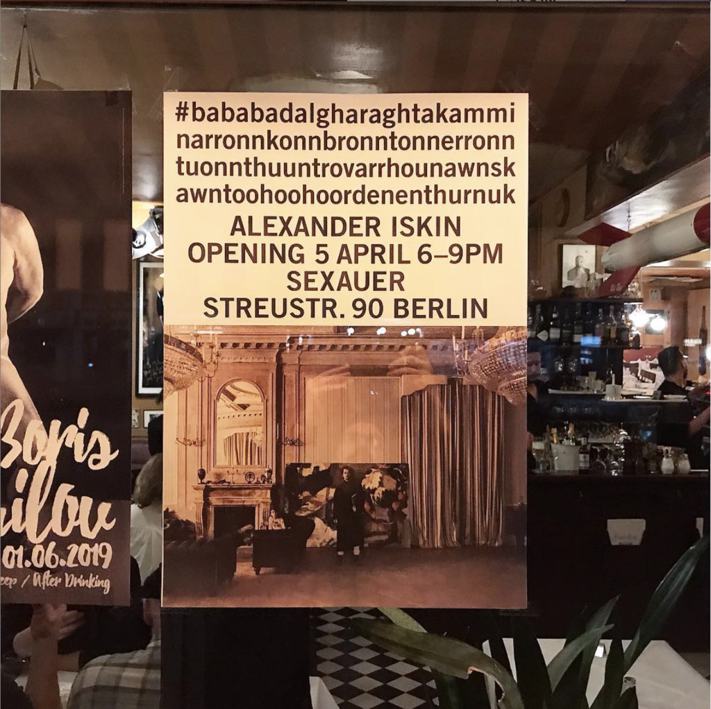 Catch Alexander Iskin’s new exhibition, #bababadalgharaghtakamminarronnkonnbronntonnerronntuonnthuuntrovarrhounawnskawntoohoohoordenenthurnuk at SEXAUER.