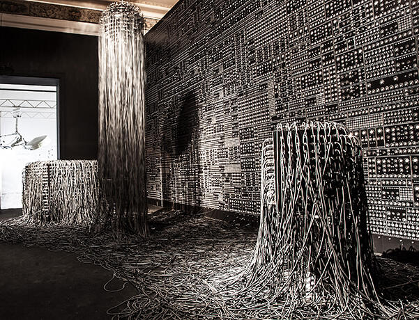 In the center of the exhibition a space-consuming installation: DAIMON. Under the ceiling of the hall a sphere like a lamp; on the floor a cube like a table; not far away an armchair-like object. The three black, abstract furnishings are equipped with hundreds of metal sockets, in which black cables are inserted, connecting the objects with each other. In this way, a network is created within the space, as well as forming a drawing on the gallery floor. The drawing is continued two-dimensionally on a wall paper on which cable sockets and knobs are depicted. DAIMON is reminiscent of a living room because of its furnishing-like objects, but also of a darkroom because of its black, rubbery, and metal fetish-like components.