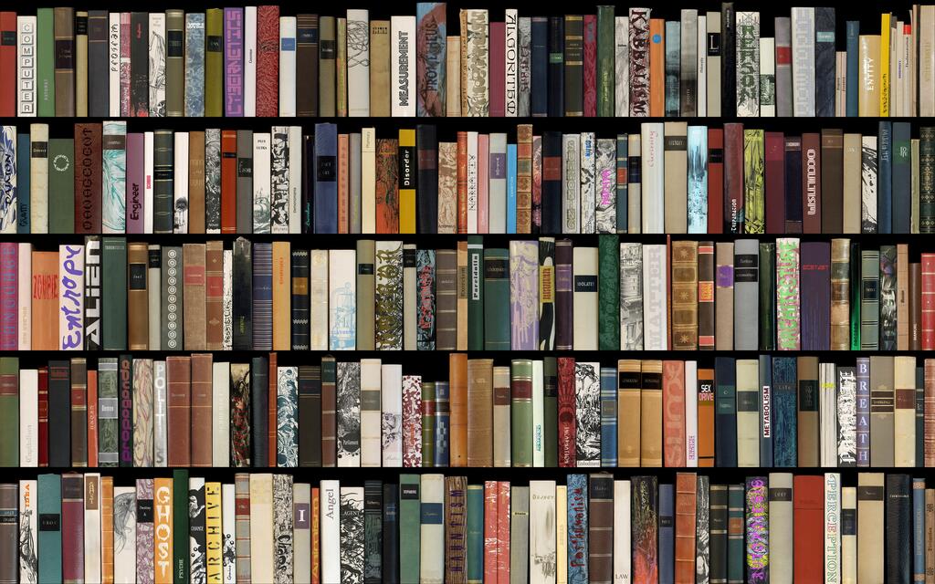 Pandemonium consists of various C-prints of the same size. As in a bookshelf, hundreds of book spines are depicted on them, whose titles gather terms of a new demonology from antiquity to the present. The terms are etymologically, phenomenologically, or structurally related to daimon. For some terms, the etymological connection is not known by everyone. An example of this might be democracy. Demos is the people of the state. However, demos is derived from daimon. The Indo-European da means to divide or apportion. The daimon thus allocates and supervises state coexistence in the polis.