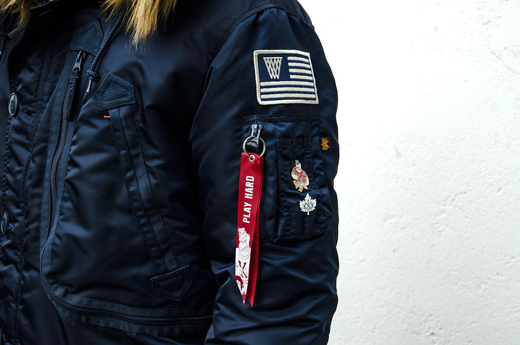 Renowned US-Military supplier Alpha Industries (1959) and German basketball brand K1X (1993) have teamed up for the remix of a classic. The iconic 'Replica Blue' colored Polar Jacket features some nice details, such as a removeable fur hood/lining, some custom pins, the Chiefglider mascot and Nation of Hoop flag, detachable velcro tags, or Co-branded flag labels, logo stitchings, zipper pullers and signal-strap.