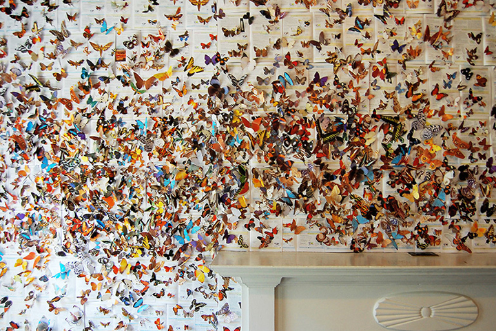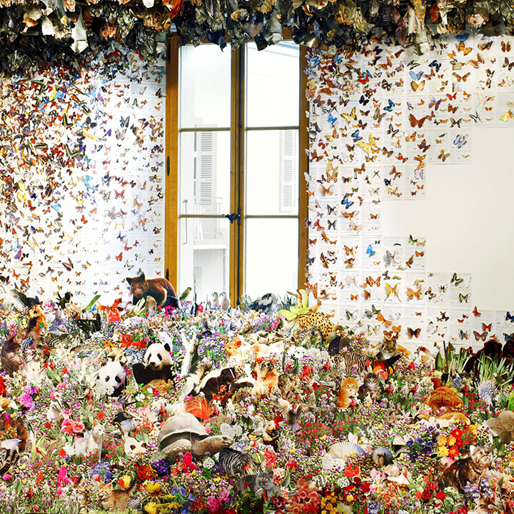 Obviously a funny nod to H.G. Wells' famous novel, the installation consists of hundreds and hundreds of cutout animals and plants from old textbooks, which the artist meticulously arranges for a very different kind of diorama.