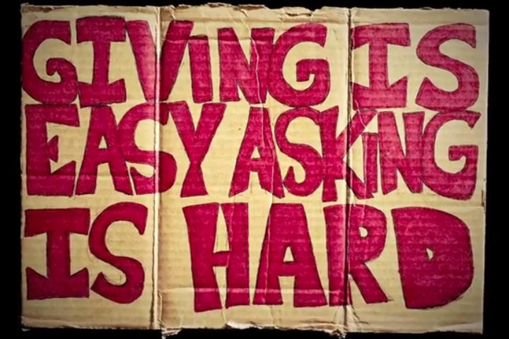 I had a certain way of approaching people. Whenever I saw anyone sitting on the street with a sign I wanted, I would crouch down, but not sit down. To sit down next to them would be like sitting on their couch without asking permission. But by crouching down, I could look them in the eye and be on the same level. Then I would say, “Can I ask you a question?” I won’t say this is a political piece, because if it is, whose politics? They always said yes and I’d say, “I’m an artist. And artists see things in a different way. And one of the things I see are the signs the homeless have. I’m buying these signs because I see every sign as a story. There are many stories out here that should be heard.“