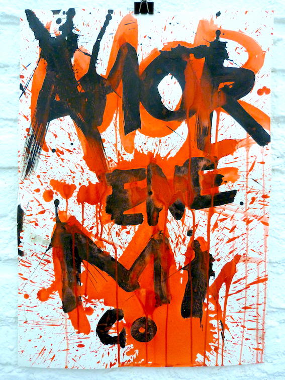 Materials such as acrylics, oil, ink, charcoal, pastel, coffee, Edding, found pots, lipstick, vodka and glue are smeared and exploded as infinite revolts are staged against order and the frozen moment of beauty. Provocation of mistakes and accidents is employed to liberate an instinctual response and dismantle any traditional notion of ‘finished work’. This elaborate process of attack unveils a compulsion to resist patterns and the contrivance of a particular style. A self-confessed art whore, each work is a turned trick of discarded notes, torn posters, messages on walls, blow-ups, pin-ups, photo copies, transfers and street detritus. Traces of intimacy, records of desperate emergency and messages of authority are recycled into the pulp of universal human experience.