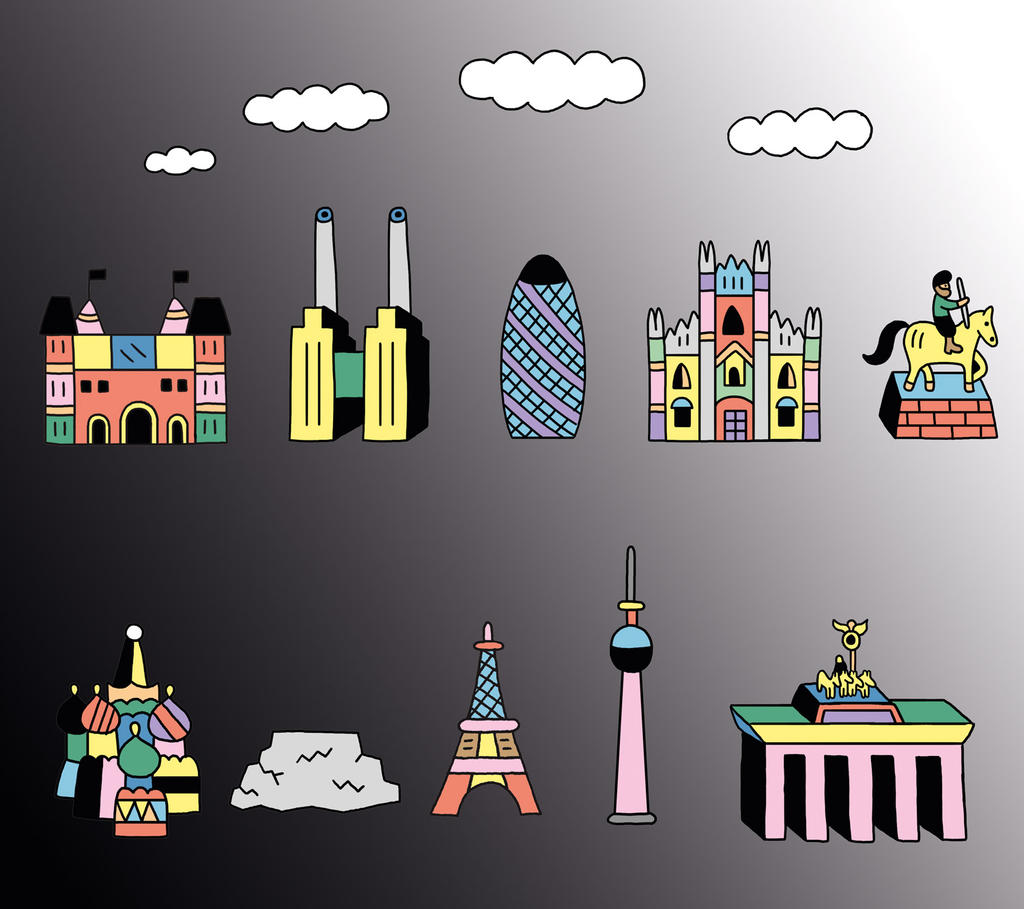 The figure he designed for the campaign “ONE WITH THE CITY” puzzles various illustrations of interesting places reflecting Berlin, London, Madrid, Milan, Amsterdam & Paris.