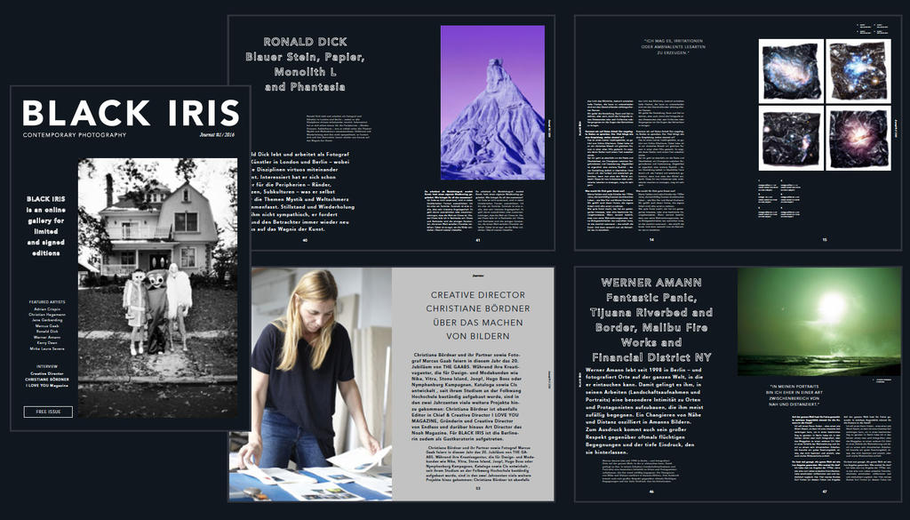 BLACK IRIS is an online platform for contemporary photography. It delivers a careful selection of photographs aiming at young but also experienced collectors and of course photography lovers. It serves an online shop with a corresponding journal, that gives an additional insight into the work and lives of our photographers as well as updates about relevant events and exhibitions.