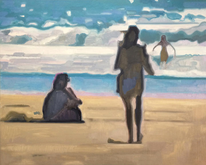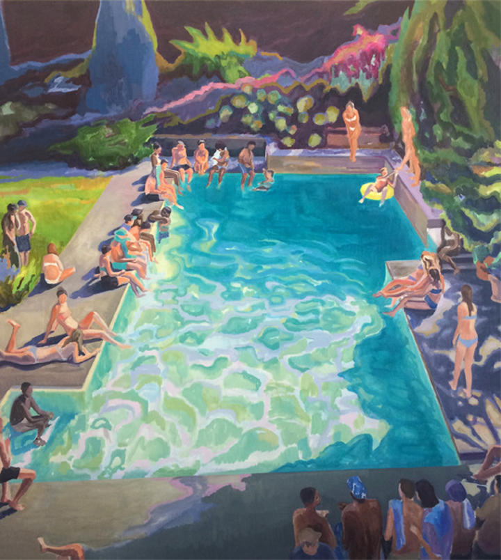 “These paintings have been created in the studio through a process of distillation and color mixing based on memory, photographs and sketches. Form, figure and color compose Lotti’s palette. As in the works of David Hockney, the figures are the subject of the paintings as much as the colors and locations are. A student of color and texture, Lotti offers the viewer a dreamscape in which to enter: oranges and purples meet rather than collide; swimming pool scenes offered in both day and night render the subject immutable; tennis players run on pink and blue courts with violet mountains in the distance; surfers ride crisp and deep blue waves with a hot orange beach in the foreground. Figures are wrapped by broad patches of fuzzy color and structure that evoke movement and rhythm.