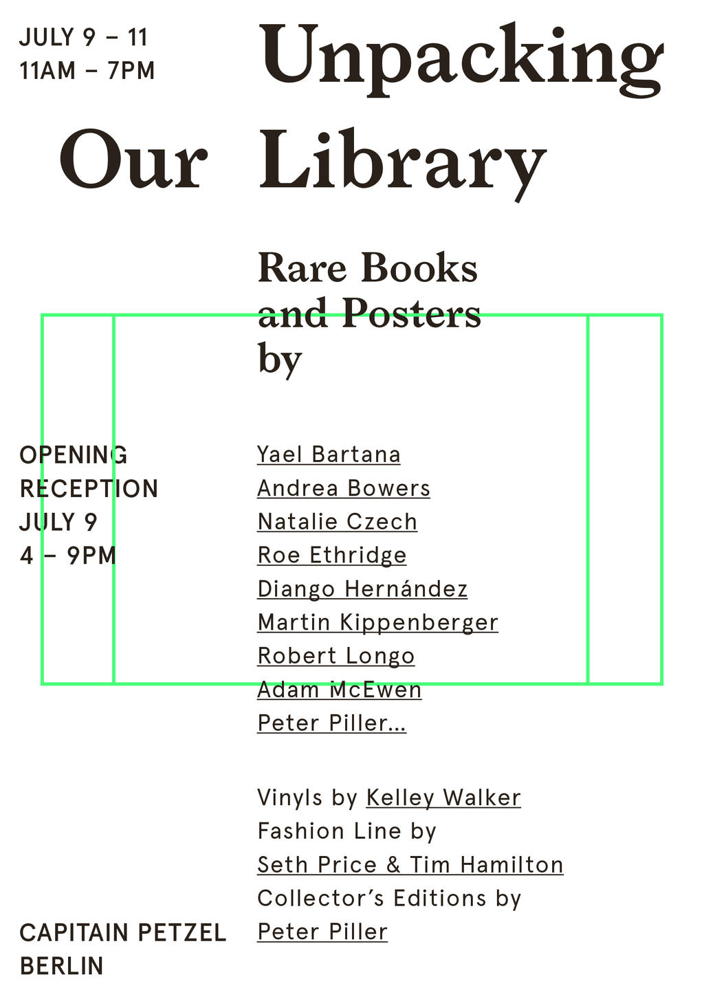 Capitain Petzel gallery are unpacking their library and invite you to get your hands on a collection of selected publications, artist books, editions, posters, CDs and vinyls!