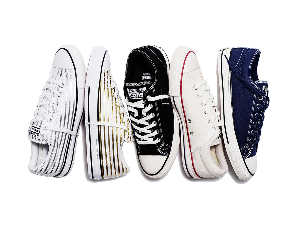 "The heavy vintage canvas uppers are finished in three classic colorways: black, parchment and navy – each with contrast white stitching and nickel hardware - as well as two bold metallic striped versions, finished in silver and gold on a clean white base, with tonal hardware."