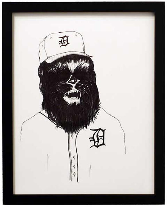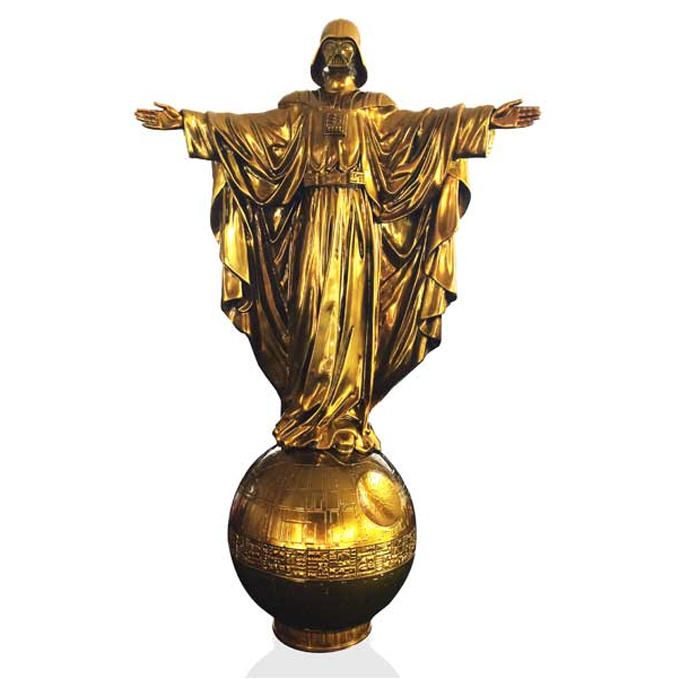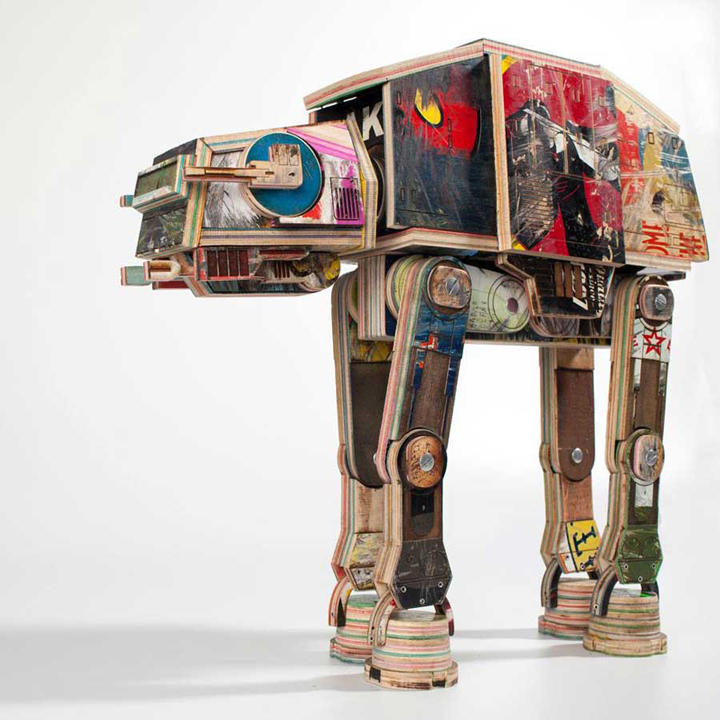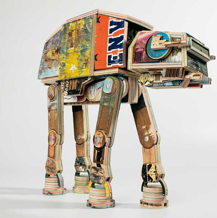 artwork from top to bottom: Derek Keenan : AT-AT / constructed from skateboards / 16“ x 17“ // Axel Geittmann : Wookie of the Year / ink on paper / 11“ x 14“ // Axel Geittmann : Always Hatin’ / ink on paper / 11“ x 14“ // Sket-One : Our Father (gold edition) / resin sculpture / 25“ x 16“ // RYCA : Helmet Inverse 1 / glow in the dark acrylic + silkscreen on canvas
