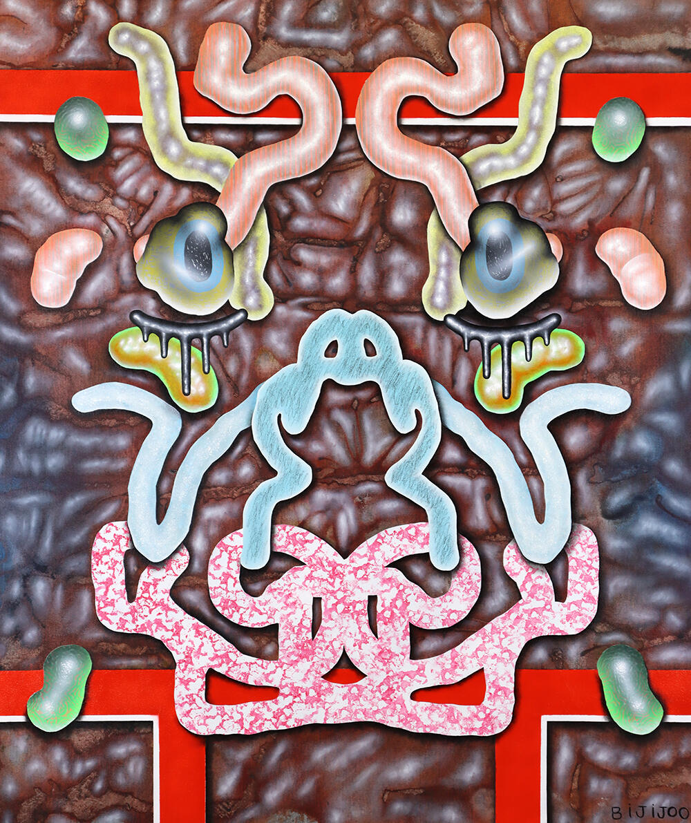B has been painting and drawing since childhood. He has experimented with figurative, abstract and conceptual work in a variety of media, including writing, music and video. B diverged from art practice to pursue technical studies in mathematics, physics, computer science and chemistry, culminating in a Ph.D. in biophysics in 2008. He then returned to painting by creating several series of surrealist works, including The Presidential Ham, Celebrity Still Life, and The Arthropod Companion. After pausing to remodel an old house and become a father, he began resetting his painting practice in 2018. B’s current work draws on his technical background in math, science and computer programming, as well as his young daughter’s imagination and love of monsters. B has a day job working at Nike at the interface of digital design & innovation and intellectual property.