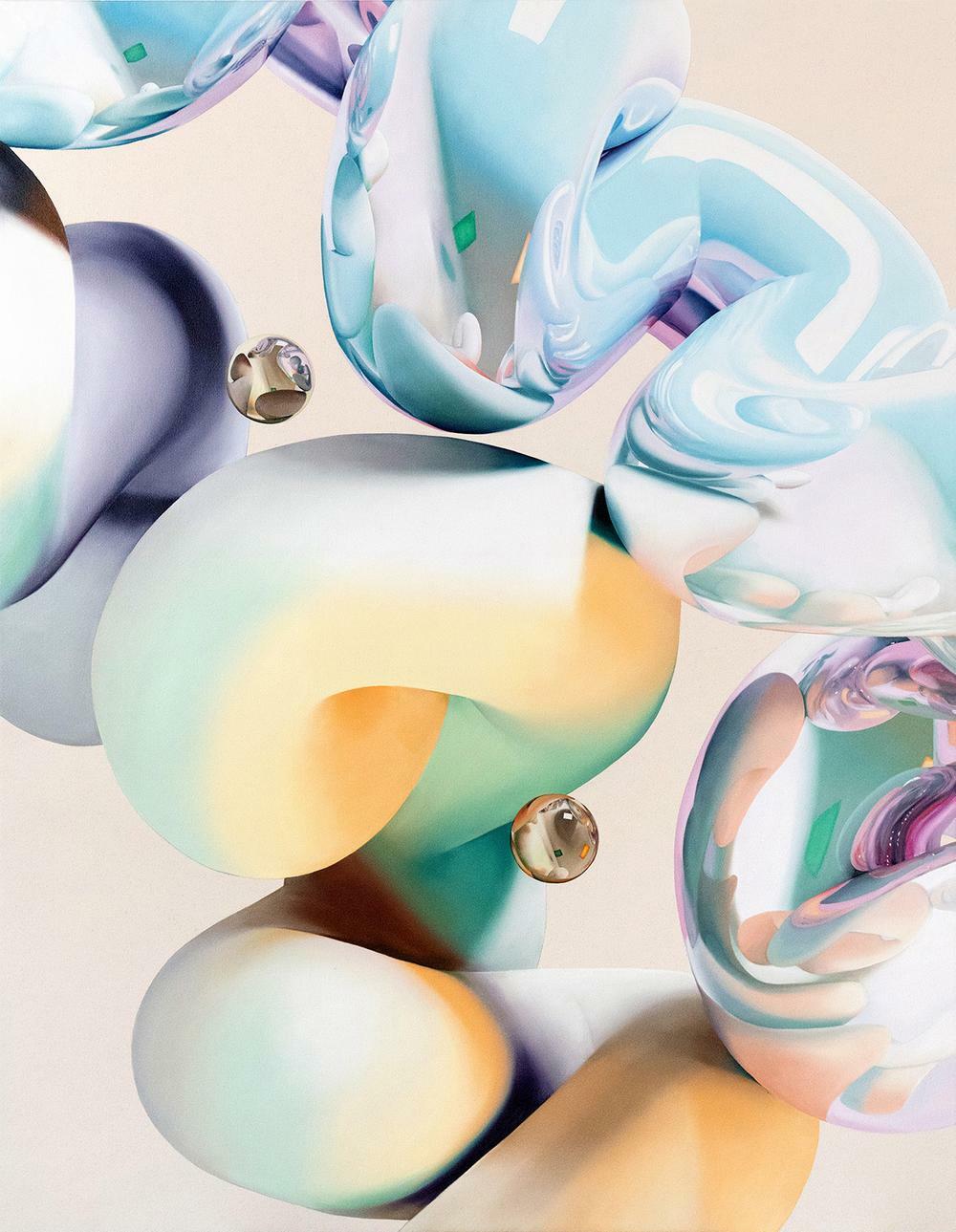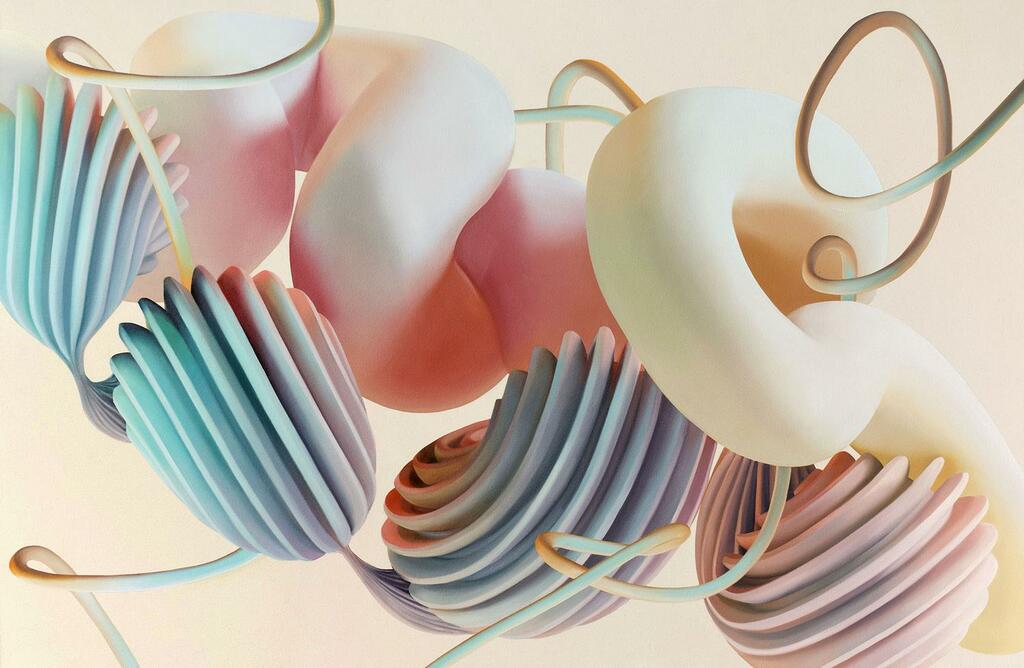 Vickie Vainionpää’s practice considers the impact of technology on the process of painting and investigates the relationship between natural forces and digital processes. In her ongoing Soft Body Dynamics series, twisting, tubular forms are systematically created using generative 3D modeling software. The software randomly generates a set number of splines per day, from which the artist selects to create final compositions which are painted by hand using oil on linen. These shapes curve, fold, and morph in ways reminiscent of limbs, intestines, or cellular organisms. In many ways they hold life in themselves, coming from a different kind of nature — a parallel wilderness — regulated by the forces of chance and uncertainty inherent to their digital environment. By embracing new digital means of reading space and content, the works draw attention to the ever-changing relationship between the human body and digital technology.