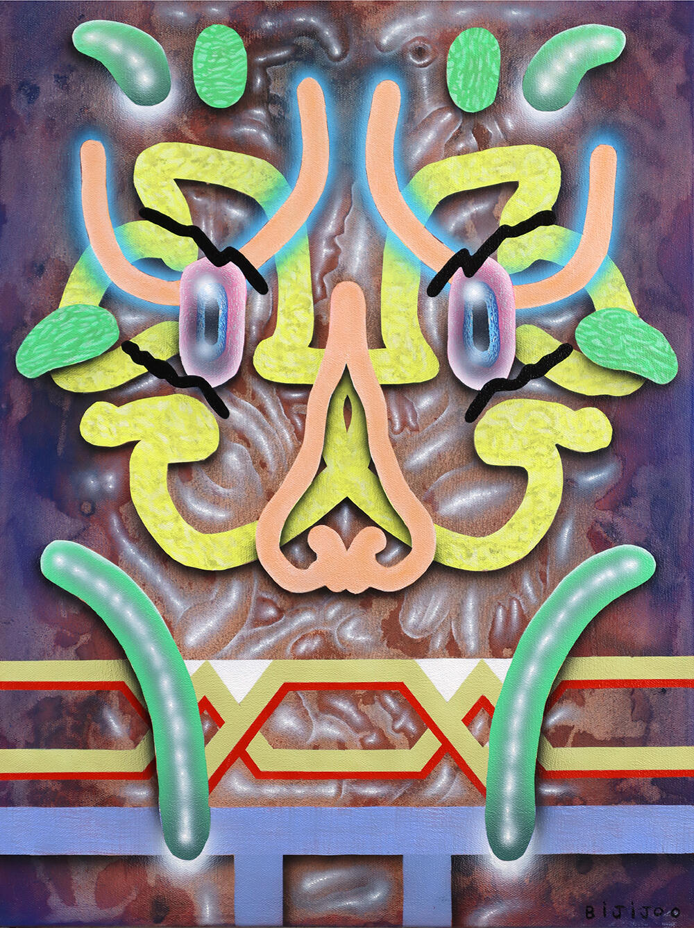 For “Digital Spirit”, Vickie and Bijijoo dive head first into making a dramatic impact on how technology is used to plan and portray a rendering of images to then be put onto canvas. Both artists’ paintings result from process-driven experimentation with painting media and automatic drawing, using traditional and digital techniques. It truly is a one of a kind exhibition where both artists bounced ideas off one another to find similarities to portray in each painting to really identify as a “duo” for this show.