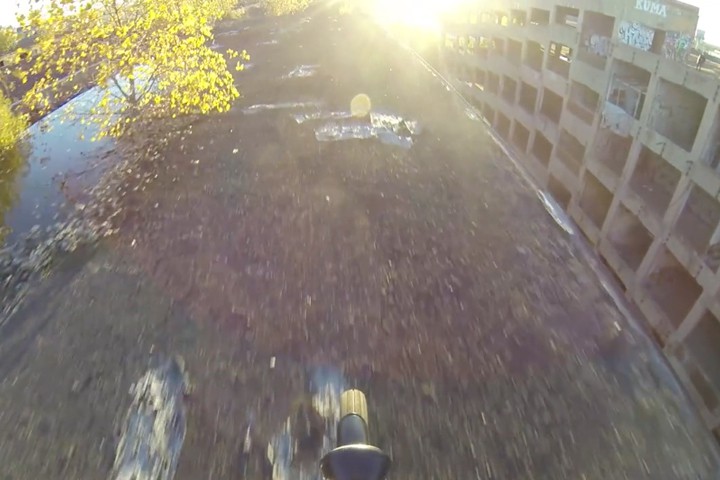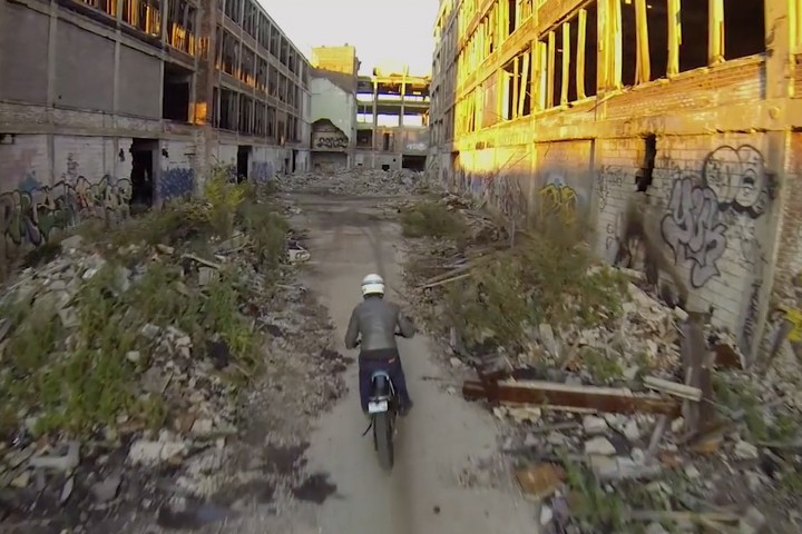 Last autumn, the guys behind Cantini Pictures Ltd. took their self-built motorcycle (and their drone) to Detroit's abandoned Packard Plant for a ride.
