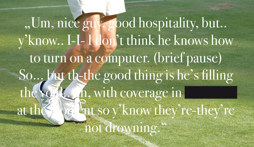 „Um, nice guy, good hospitality, but.. y'know.. I-I- I don‘t think he knows how to turn on a computer. (brief pause) So... but th-the good thing is he's filling the void.. uh, with coverage in xxxxxxxxxx at the moment so y'know they're-they're not drowning.“