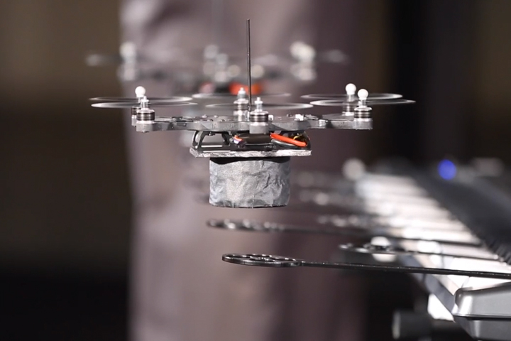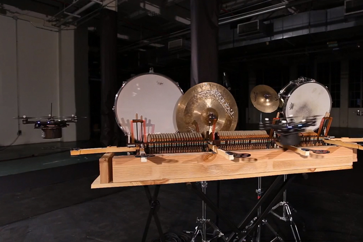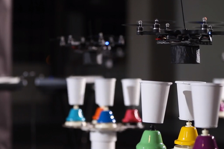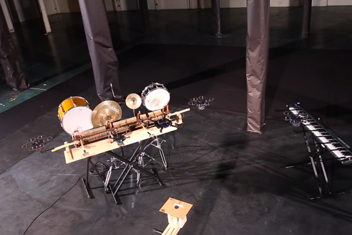 “KMel Robotics presents a team of flying robots that have taken up new instruments to play some fresh songs. The hexrotors create music in ways never seen before, like playing a custom single string guitar hooked up to an electric guitar amp. Drums are hit using a deconstructed piano action. And there are bells. Lots of bells.“