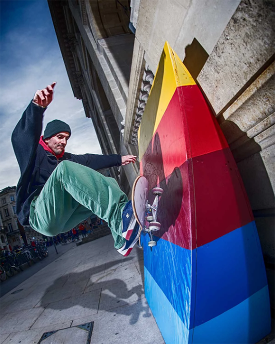 Rather than confine skaters to skateparks, Leo got officials to allow skateboarding at some of the best city center spots during certain hours, where it had previously been illegal. The city even let Leo’s crew skate and film inside the Historic Opéra National de Bordeaux. The culmination of Leo’s ambitious vision was the PLAY! Project for Liberté Bordeaux, an exhibition of playable and skatable installations displayed in public spaces. The skateable art pieces were placed in public spaces throughout the city, free for anyone to play, skate, nap, eat, or sit on.