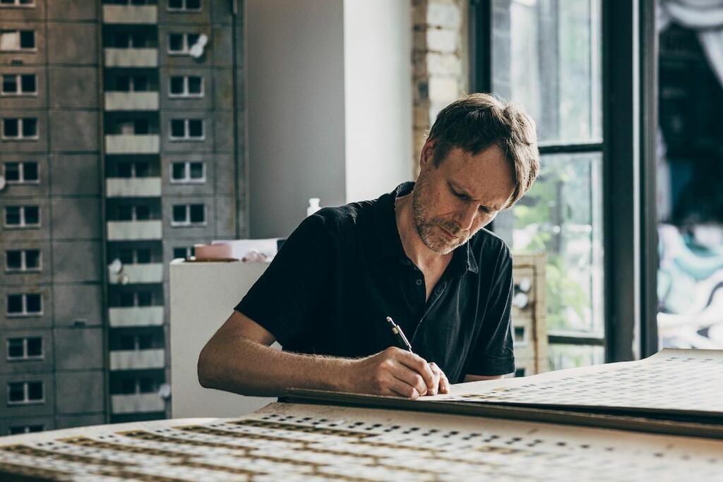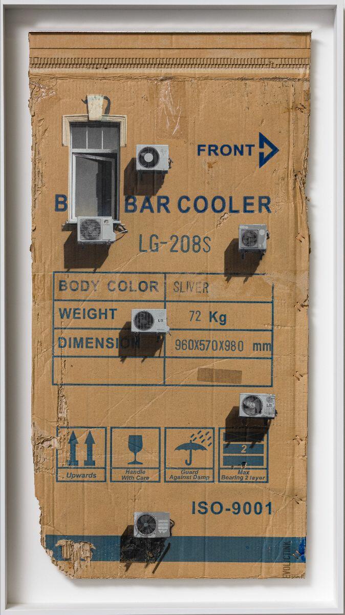 His production is as rare and precious as his materia prima is common: the cardboards he uses are invisible and soon-to-be-discarded materials. But don't be mistaken: finding the perfect cardboard for an artwork is a difficult quest, where color, hue, logos and stamps, fractures, accidents and scratches, must align to give birth to his extremely detailed stencils.