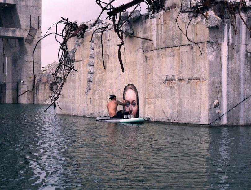 Why should urban art be only for pedestrians? Sean Yoro, aka Hula, paints women half emerged from the sea on his native island of Hawaii. The murals are painted along the concrete walls of ruined and abandoned structures, which gives a total new poetic and peaceful vision. To reach the spots, he paddles on a surfboard to find the best locations for his art, even managing to balance his paint cans as well.