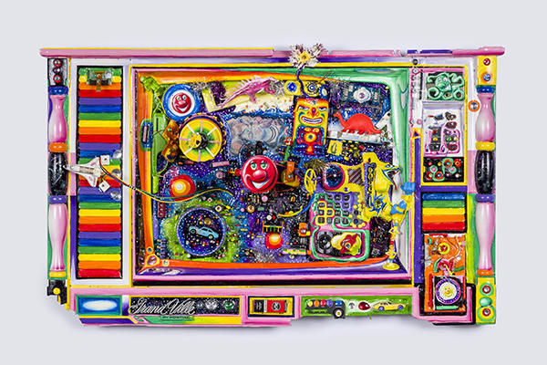 Scharf uses paint along with plastic beads and decorations, layering colors and objects to create fantastical, intimate dioramas that reference Scharf's lifelong concern about the detrimental environmental effects of discarded plastic. These three series all engage rectilinear forms as framing and structuring devices but resist the traditional rigidity of the grid, inviting playful imagery and bold color into its structure.
