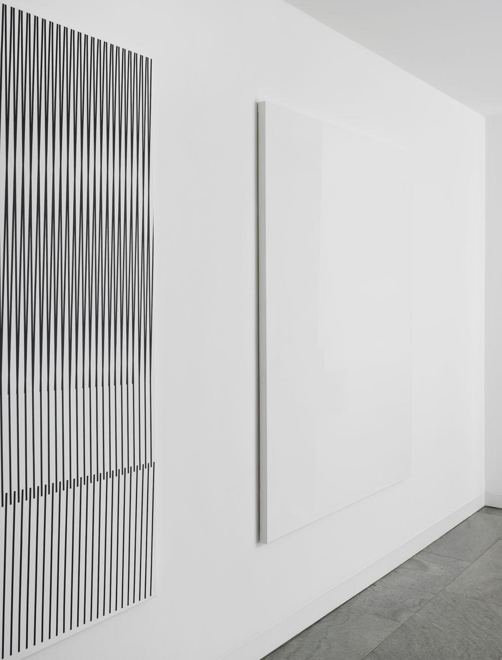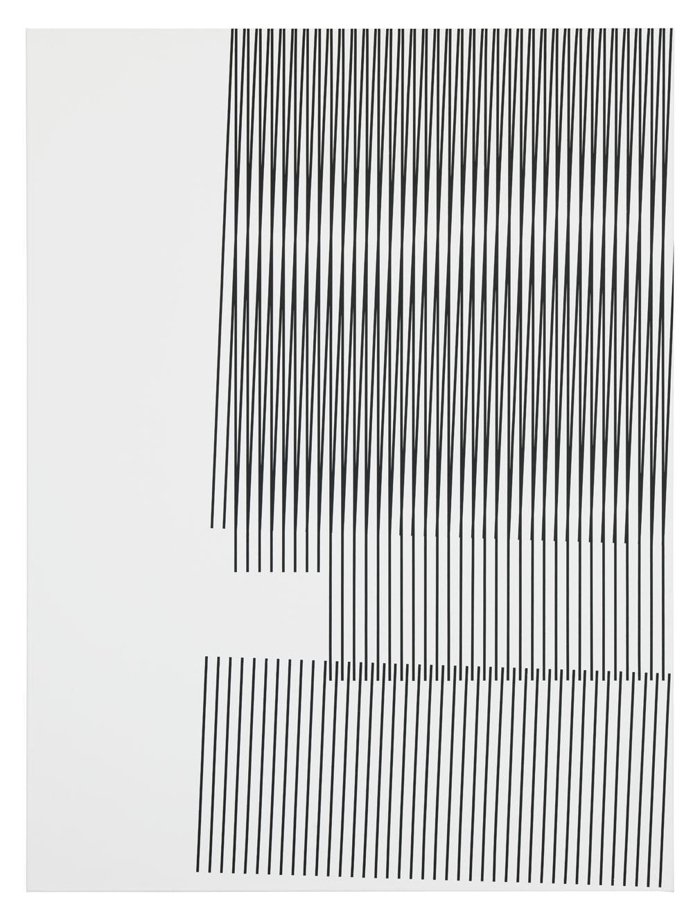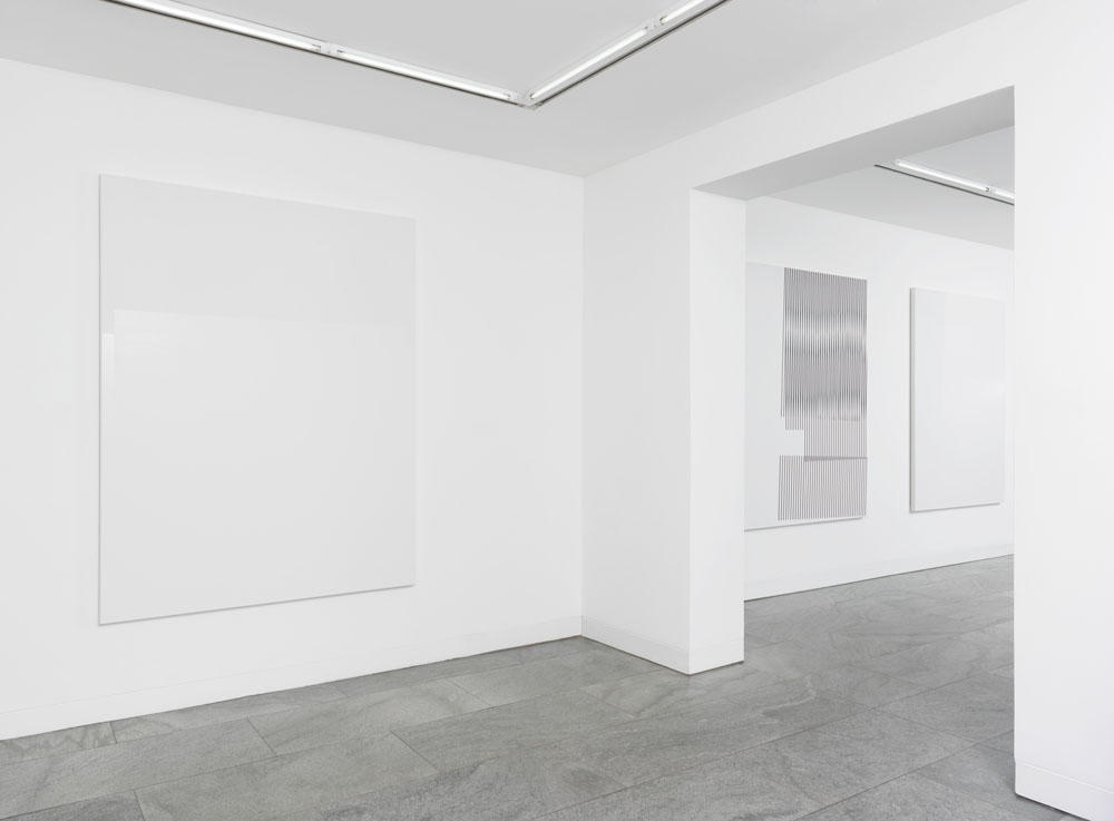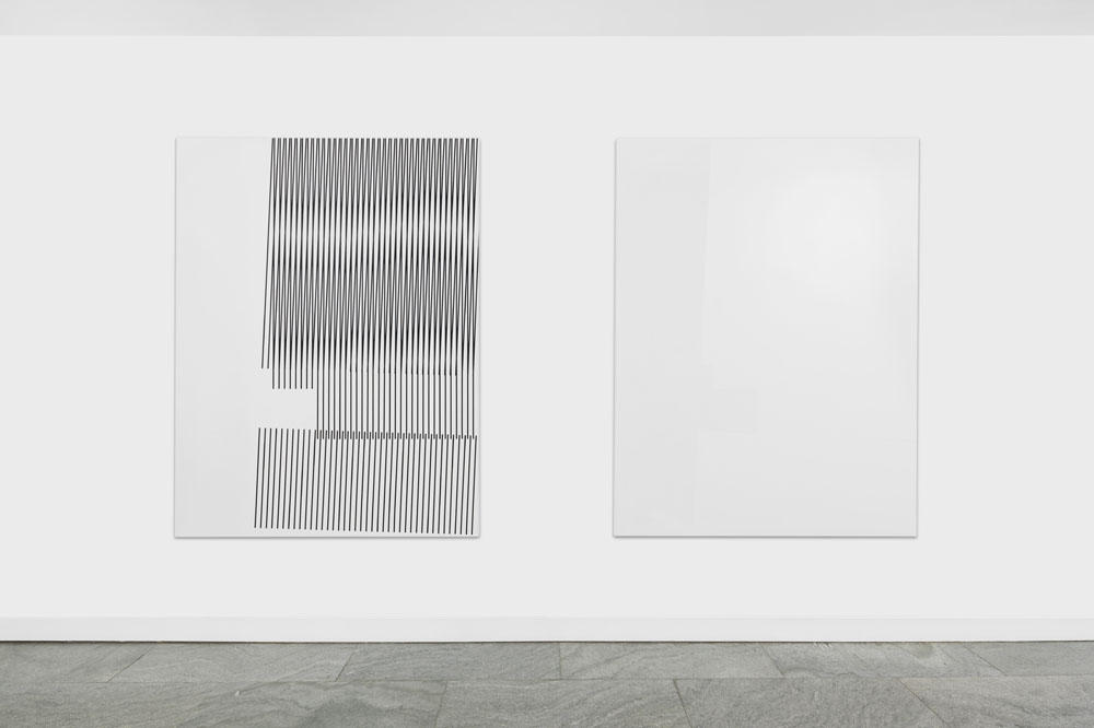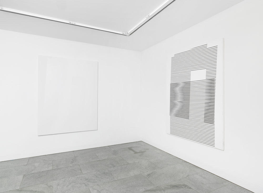 Like Kito Nedo reminds in his essay “Less narrative, more protocol”, viewers who have been partying a lot in the 90’s might find an association with the Techno culture such as pulsating visuals or fast music beats. Yet, for Jörres black is quite while the white provides light. His paintings, in their purity of form and rigorous design, are changing the classical mode of abstraction.