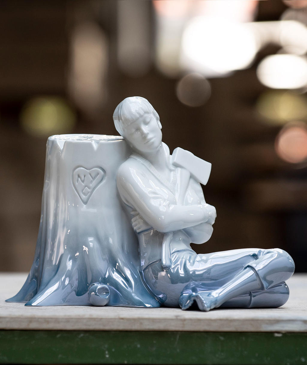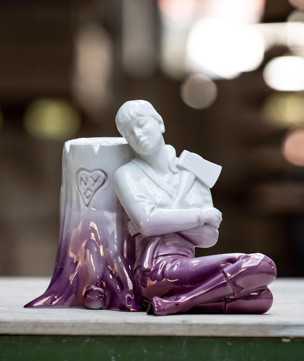 When FAILE artists Patrick Miller and Patrick McNeil met with KPM Berlin for the first time in 2017, it was still completely open what a joint project could look like, but quickly it became clear that the joint object was to be a porcelain version of an iconic character for the New Yorkers: The dreamy girl, created for the first time in porcelain, leaning against a tree trunk, belongs to a motif known in the 20-year success story of FAILES and the international art scene.