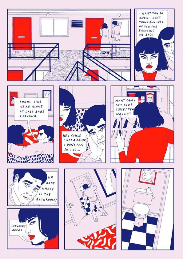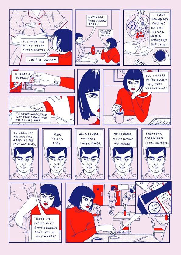 “First Date“ illustrates the love life of Mara, an independent and cold woman. At first glance you might think that this will be one of those charming love stories, but luckily it's quite the opposite! This comic is a film noir piece told on just four pages in which a woman and a man meet for the first time in a breakfast place. The guy keeps praising the clean lifestyle with no meat, no tattoos, no alcohol, no nicotine, no sugar, and basically… no fun.