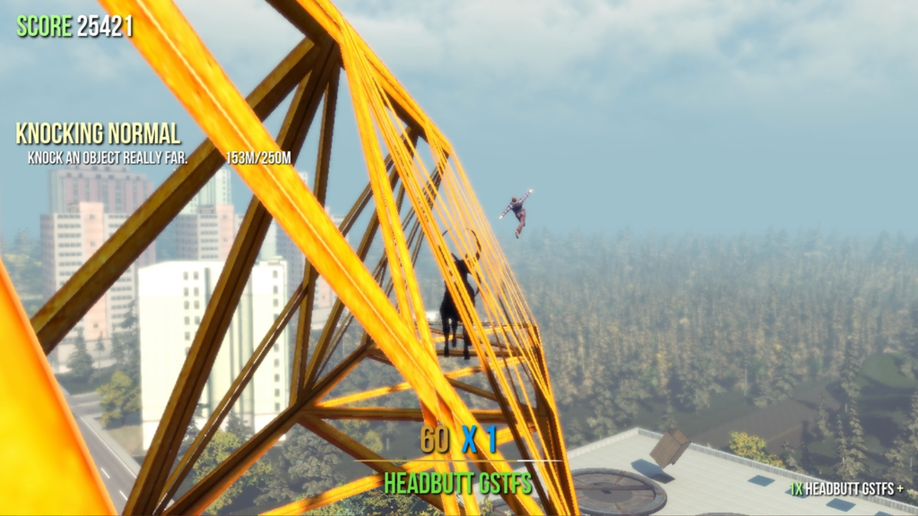 Entering the game you stand four-legged in a field with your buddy. As soon as you take control, fence panels begin to fly, people scream in fear and objectives pop-up on screen. This game isn't about conquering objectives though, they're put in place to aid you in finding a glitch thats funnier than the last, and to unlock new abilities.