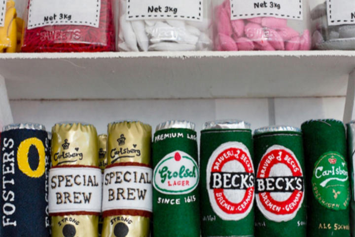 All your favourite products from the corner shop will be shown in a fluffy and toylike format. Chocolate, booze, candies, cigarettes, and even the cash register was made by hand by the talented Ms. Sparrow.