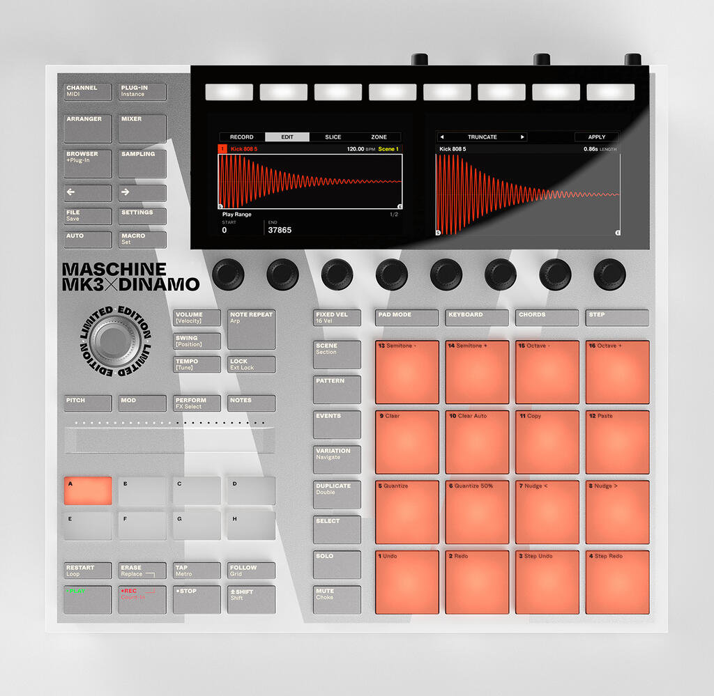 Limited to 750 pieces worldwide, the release sees the iconic MASCHINE MK3 tricked out in a silver and black screenprint with Dinamo’s Inktrap typeface on every surface – an homage to bold design and chunky aesthetics.