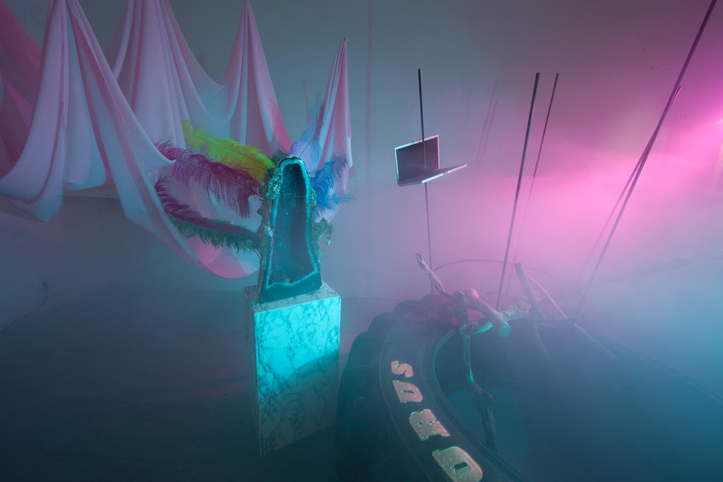 Astral Dust Astral is the first solo exhibition by Czech artist Matyáš Chochola in Berlin, held at Grimmuseum from November 22 November to January 31, 2016. In his artistic practice, Chochola combines contemporary influences of the Internet culture and computer animation with contrasting imagery of shamanistic and spiritual experiences. His sculptures and installations are characterized by antagonistic forms that exploit a range of materials - wood, glass, rubber, ceramics, tin, feathers and stone. They connect abstract forms and everyday objects, creating as a whole a harmonious chaos.