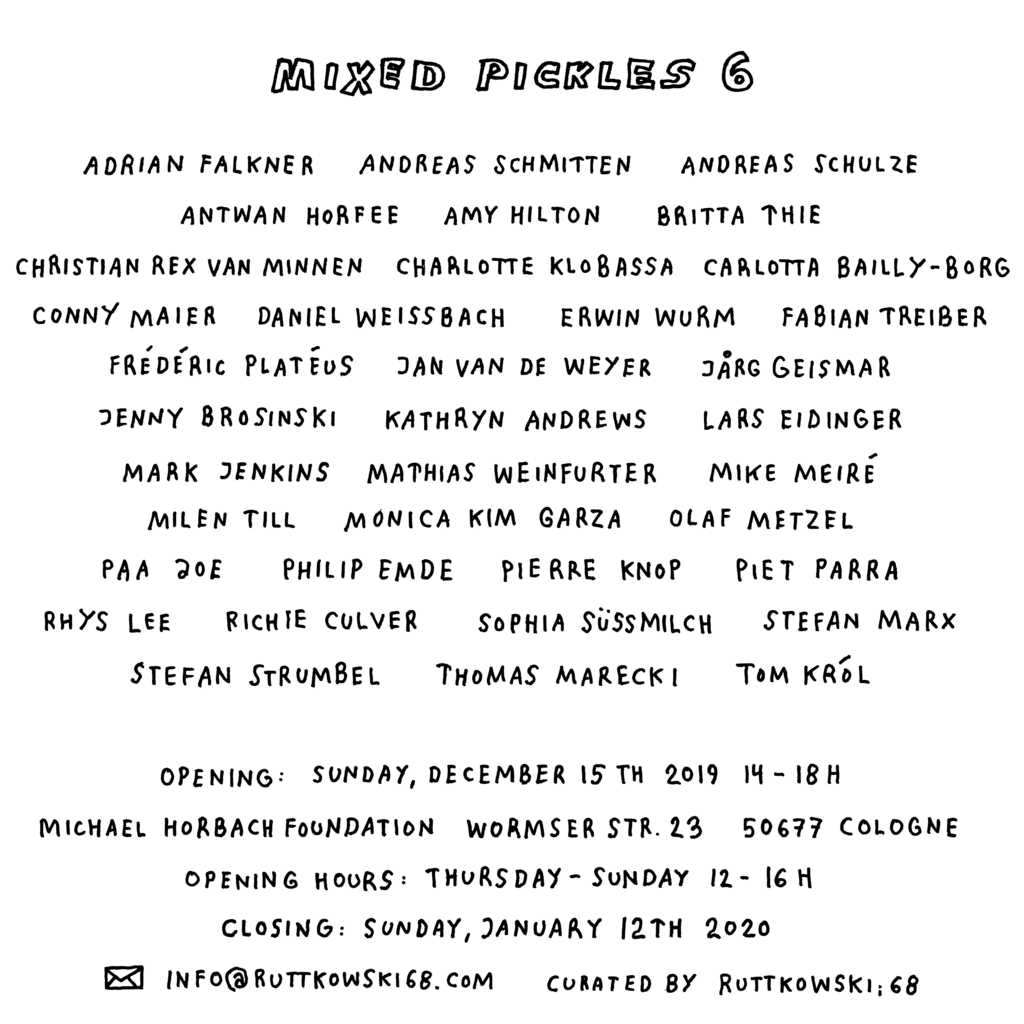 For the end of the year, Ruttkowski;68 is serving MIXED PICKLES 6. From painting to sculpture to installation and video art – this interdisciplinary show at the Michael Horbach Foundation will juxtapose differing artistic positions. As well as providing an overview of the gallery’s portfolio from its branches in Cologne and Paris – via pieces by Carlotta Bailly-Borg, Conny Maier, Erwin Wurm, Frédéric Platéus, Jårg Geismar, Kathryn Andrews, Lars Eidinger, Piet Parra, Fabian Treiber, and many more – the works of over twenty artists will also reflect the diverse spectrum of contemporary art production. Instead of a hierarchical evaluation of the works by the artist or curator, Mixed Pickles will focus on how the works affect the viewer – both via the observation of a single artwork and in the interplay of positions among themselves.