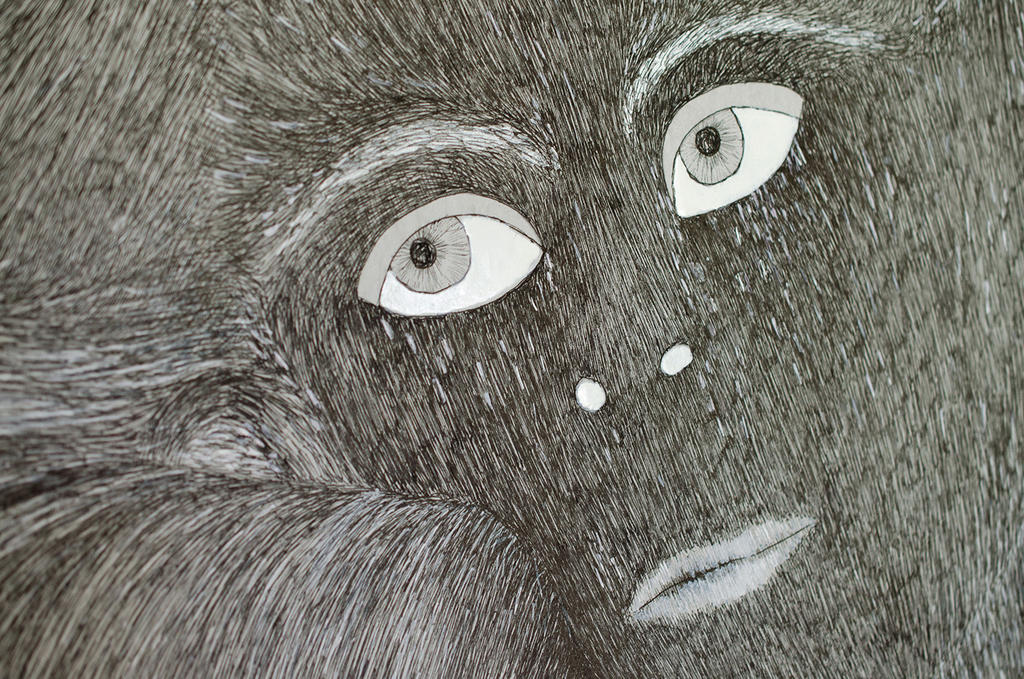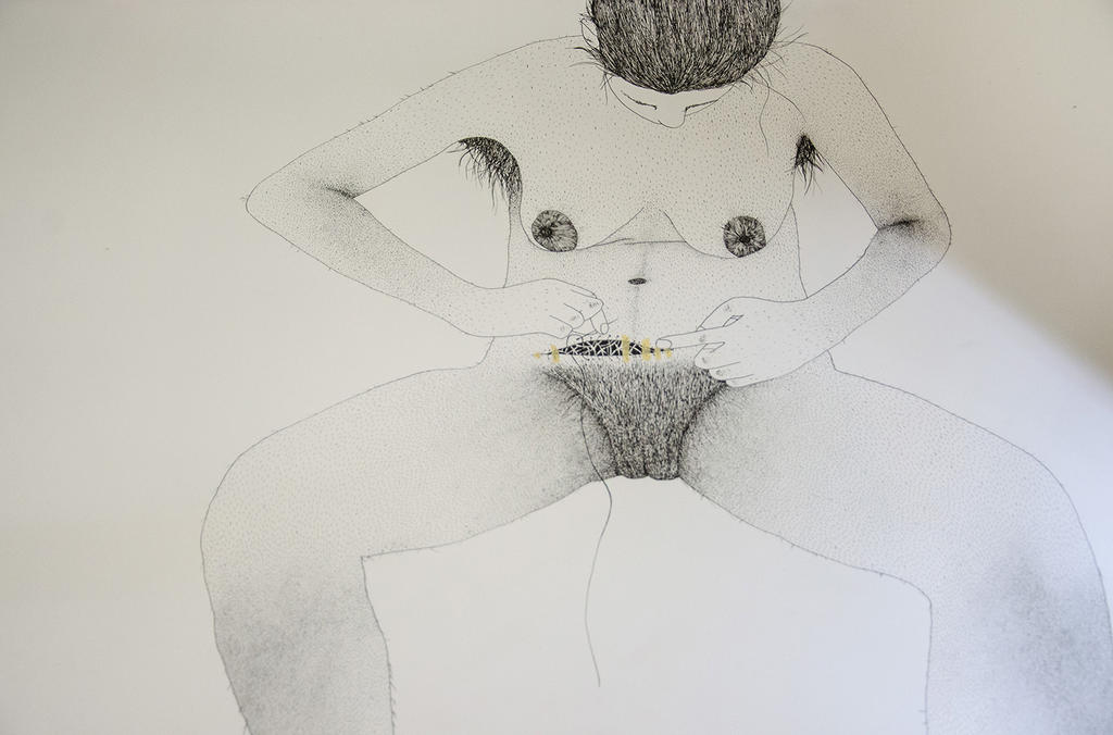In this piece the woman is holding a small injured animal in her mouth but it's not clear why, making you debate if she is trying to save it from danger or if she is the aggressor. I try to take the soft supple feminine body and present it in a dark context, giving the viewer an uncomfortable desire to ask questions about cultural conscience, social conventions and the reality we live in. I tend to use a labour of intensive and precise technique that creates a space that is rich on small details. Alluring the viewer I try to catch their attention and have them linger in front of the piece, provoking them to examine it closely. And sometimes, it seems very delicate when viewed from a distance but then when you get closer they are exposed to more of a volatile moment. I like to go back to our instincts – the ones that force us and make us survive. It’s about the beauty in pain and pleasure.