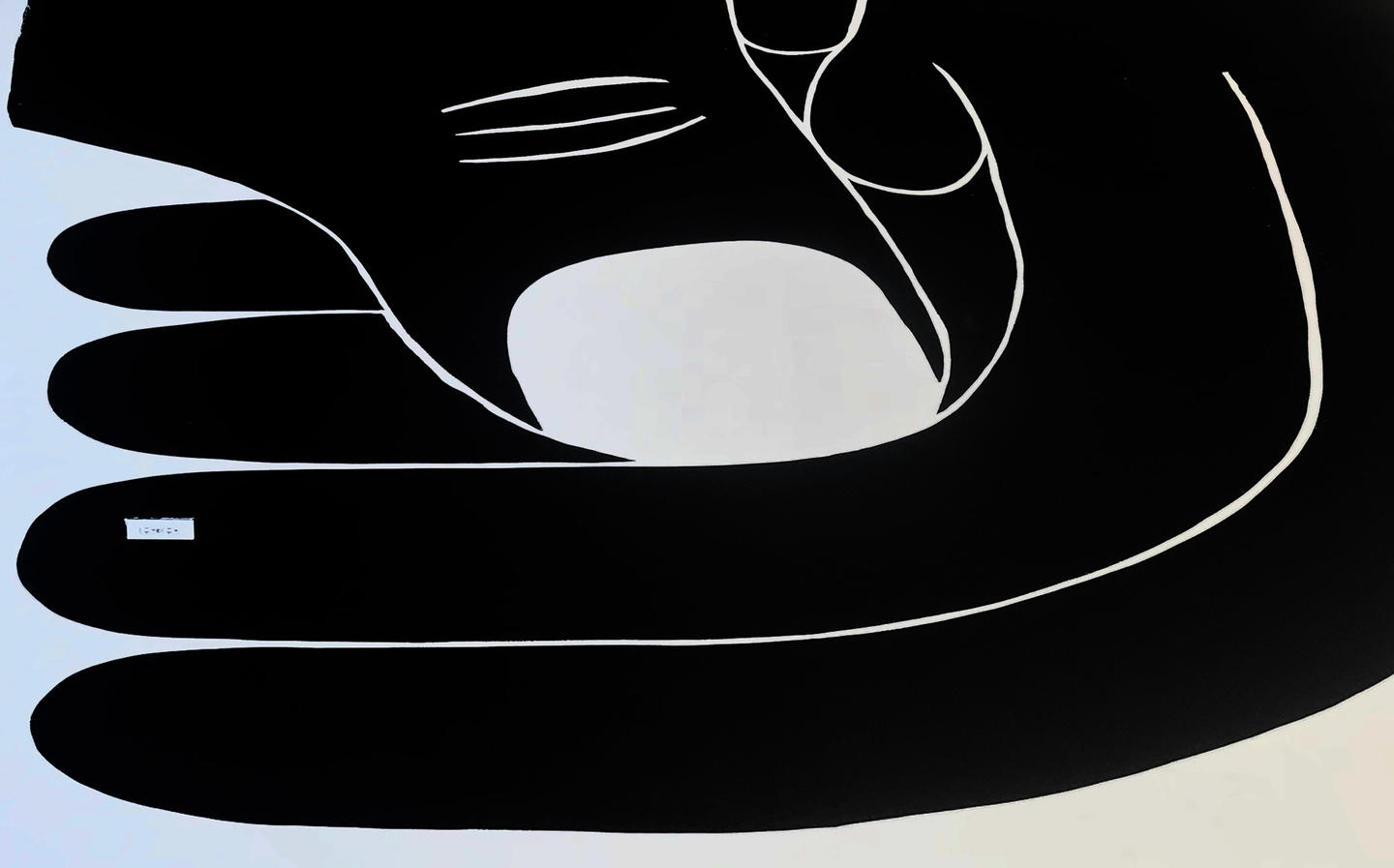 Often using humor as an entry point, Russell provokes viewers to consider their place in the universe. His clever words and bold graphics illuminate sad truths of contemporary culture, as well as empowering values. These themes of hope, reflection and transcendence take on a particular significance against a contemporary backdrop of cultural disconnection and distraction. The artist expands on this sentiment in a new series of paintings that exude the same harmony without the use of text, rather through expressive forms. This collection of large-scale paintings on panel—featuring naturalistic forms, cut and rejoined much like a jigsaw puzzle—are suggestive of objects coming together through abstract compositions and formations. Large color blocks and lines sweeping off the frame elude to a raised hand, or a simple symmetrical shape topped with a white sphere implies a dandelion, are examples of this body of work.