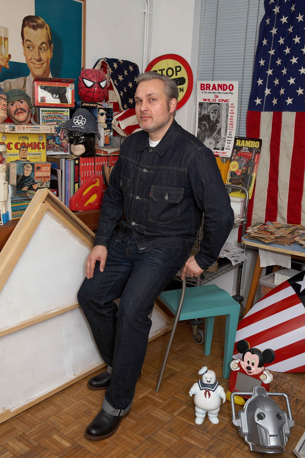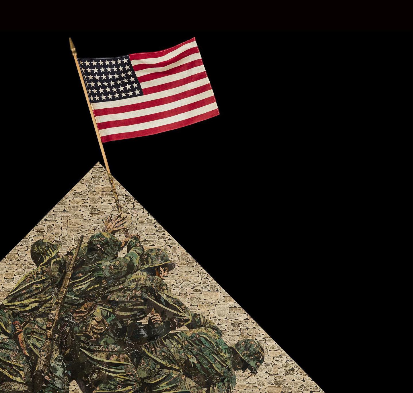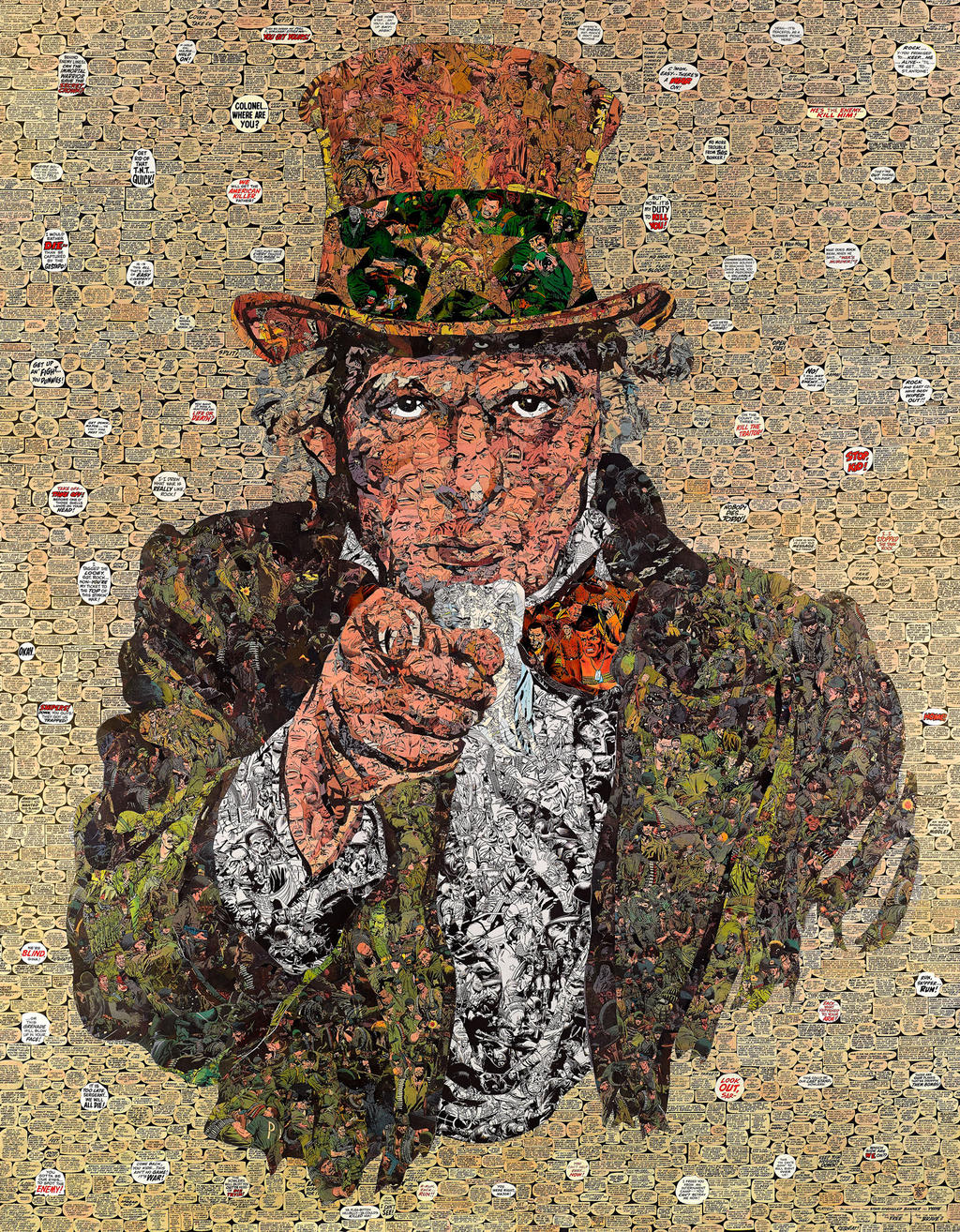 Meticulously cut-out and collaged images of propaganda, soldiers, and scenes of war are constructed from vintage U.S. comic books (pictured). A trilogy of portraits remark upon the country’s global combat history and entrenched war culture, and in ‘The Return Of The Living Dead’, used M-65 field jackets and authentic memorial funeral flags act as a statement of the horror and trauma of coming home to face an even greater fight, whether from Pearl Harbour, Vietnam or Afghanistan.